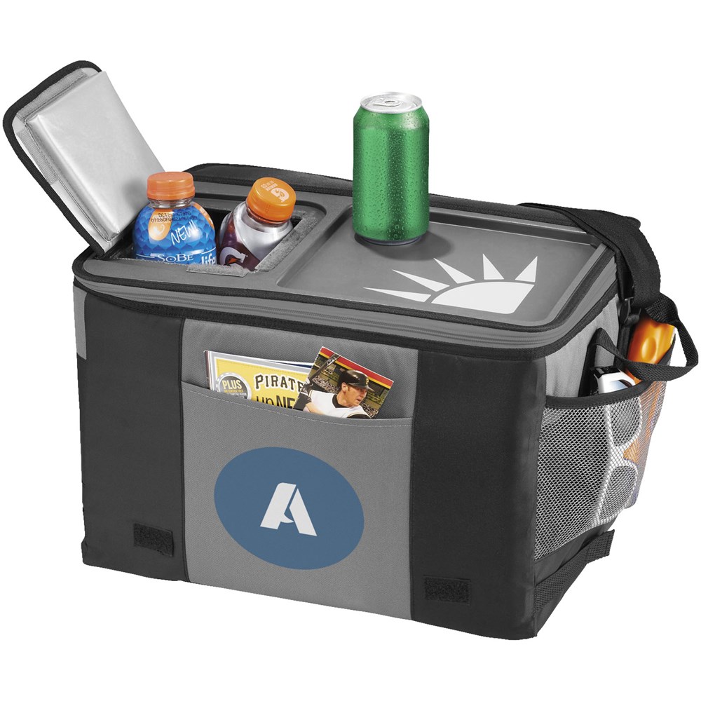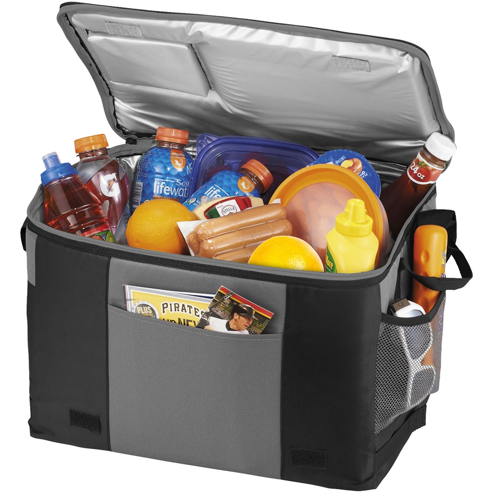 Het unieke ontwerp, met easy-access deksel die ook dienstdoet als tafeltje, maakt deze grote koeltas ideaal voor evenementen in de buitenlucht en uitstapjes. Ritsvak voor 50 blikjes. Open voorvak. Gaasvak aan de zijkant. Easy-access bovenvak met klittenbandsluiting. Hard-top deksel. Dubbele draaggreep. Backsaver™ technologie die ervoor zorgt dat je geen last van je rug krijgt bij het dragen van een volle tas. Ultra Safe™ lekvrije PEVA voering. Opvouwbaar en dus makkelijk op te bergen.
