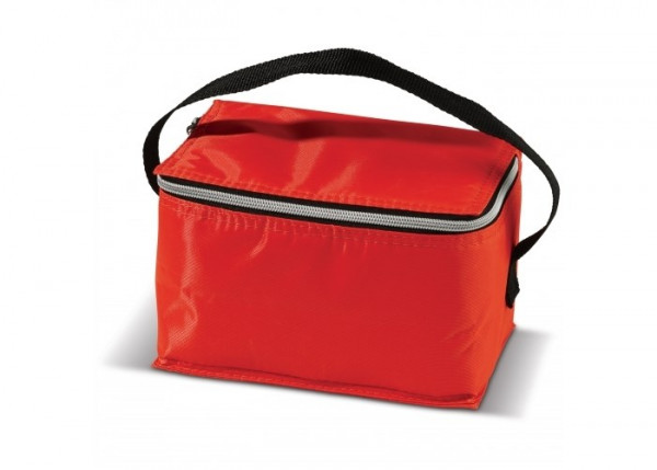 Polyester koeltas met draagriem. Compact en geschikt voor zes blikjes van 330ml. Afsluitbaar door middel van een rits.