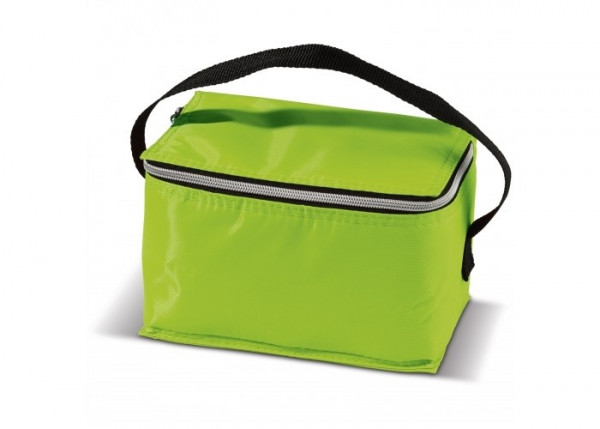Polyester koeltas met draagriem. Compact en geschikt voor zes blikjes van 330ml. Afsluitbaar door middel van een rits.