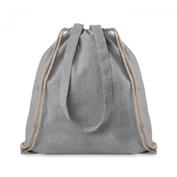 Draagtas van gerecycled katoen en gerecycled polyester met trekkoorden en lange draaghengsels. Gewicht ca. 140 gr/m². Dit artikel kan krimpen na het afdrukken.