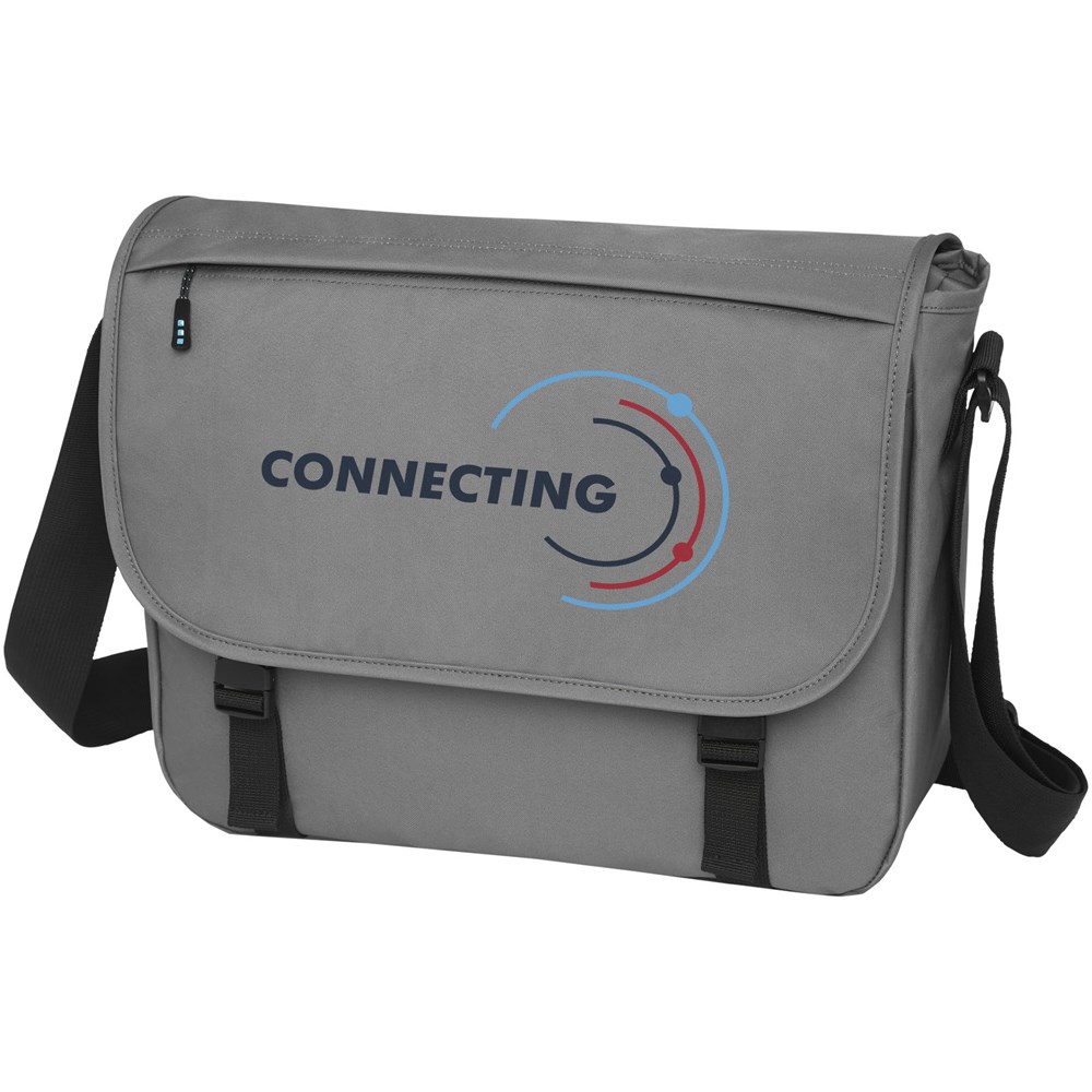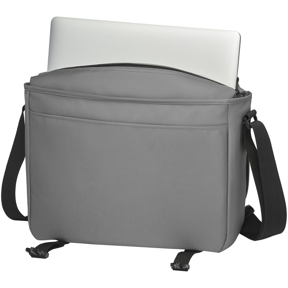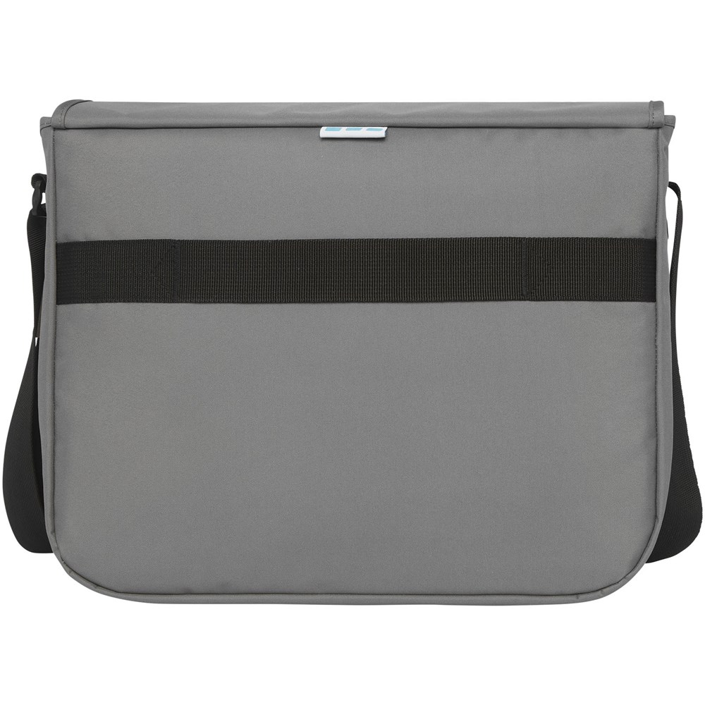 Duurzame GRS-gecertificeerde RPET laptoptas gemaakt met 60% gerecyclede materialen. Voorzien van een groot hoofdvak met ritssluiting met een gewatteerde 15" laptophoes en een voorvak (beide met klittenbandsluiting). Wordt geleverd met een overslagflap met een vak met rits en met gespsluiting. Voorzien van comfortabele gewatteerde en verstelbare schouderband en trolley tunnel aan de achterzijde.