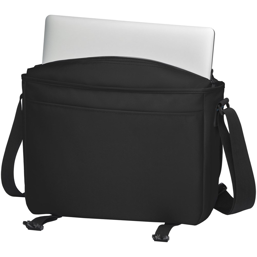Duurzame GRS-gecertificeerde RPET laptoptas gemaakt met 60% gerecyclede materialen. Voorzien van een groot hoofdvak met ritssluiting met een gewatteerde 15" laptophoes en een voorvak (beide met klittenbandsluiting). Wordt geleverd met een overslagflap met een vak met rits en met gespsluiting. Voorzien van comfortabele gewatteerde en verstelbare schouderband en trolley tunnel aan de achterzijde.