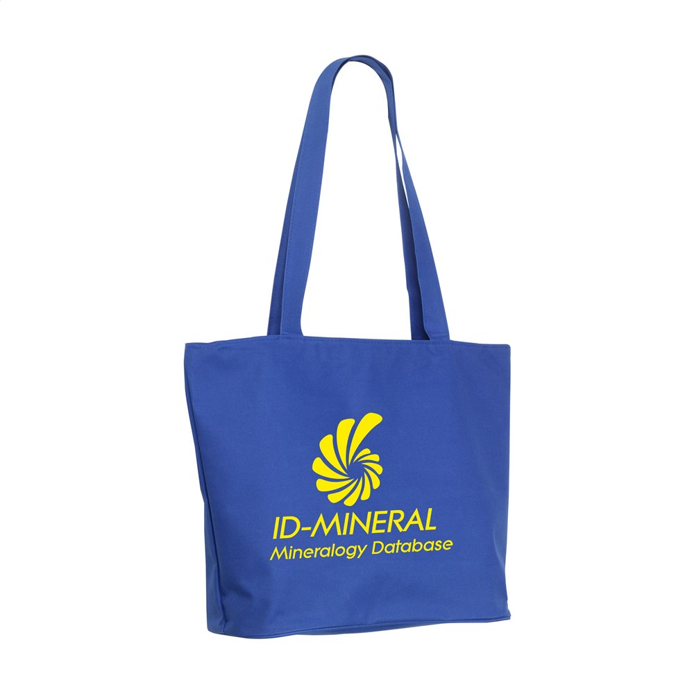 Prachtige, stevige tas van 600D polyester met verstevigde binnenzijde, lange hengsels, ritssluiting en opbergvakje met rits. De brede bodem is aan de buitenzijde mooi en strak afgewerkt met een ronde bies. Multifunctioneel in te zetten als shopper, boodschappentas en strandtas.