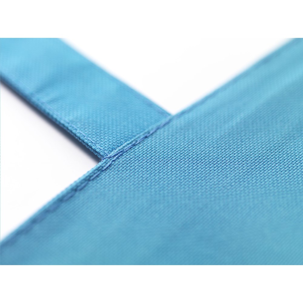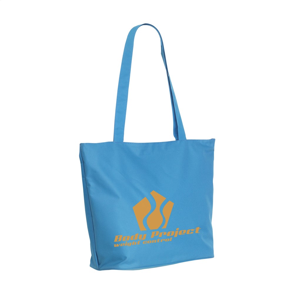 Prachtige, stevige tas van 600D polyester met verstevigde binnenzijde, lange hengsels, ritssluiting en opbergvakje met rits. De brede bodem is aan de buitenzijde mooi en strak afgewerkt met een ronde bies. Multifunctioneel in te zetten als shopper, boodschappentas en strandtas.