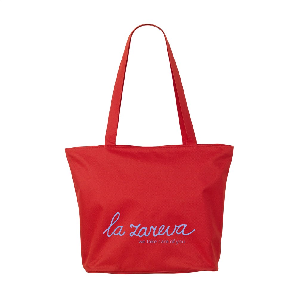 Prachtige, stevige tas van 600D polyester met verstevigde binnenzijde, lange hengsels, ritssluiting en opbergvakje met rits. De brede bodem is aan de buitenzijde mooi en strak afgewerkt met een ronde bies. Multifunctioneel in te zetten als shopper, boodschappentas en strandtas.
