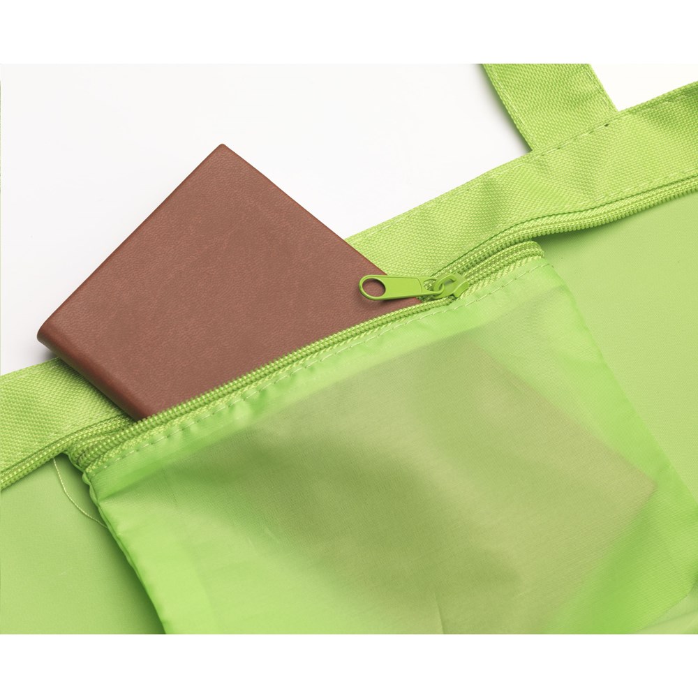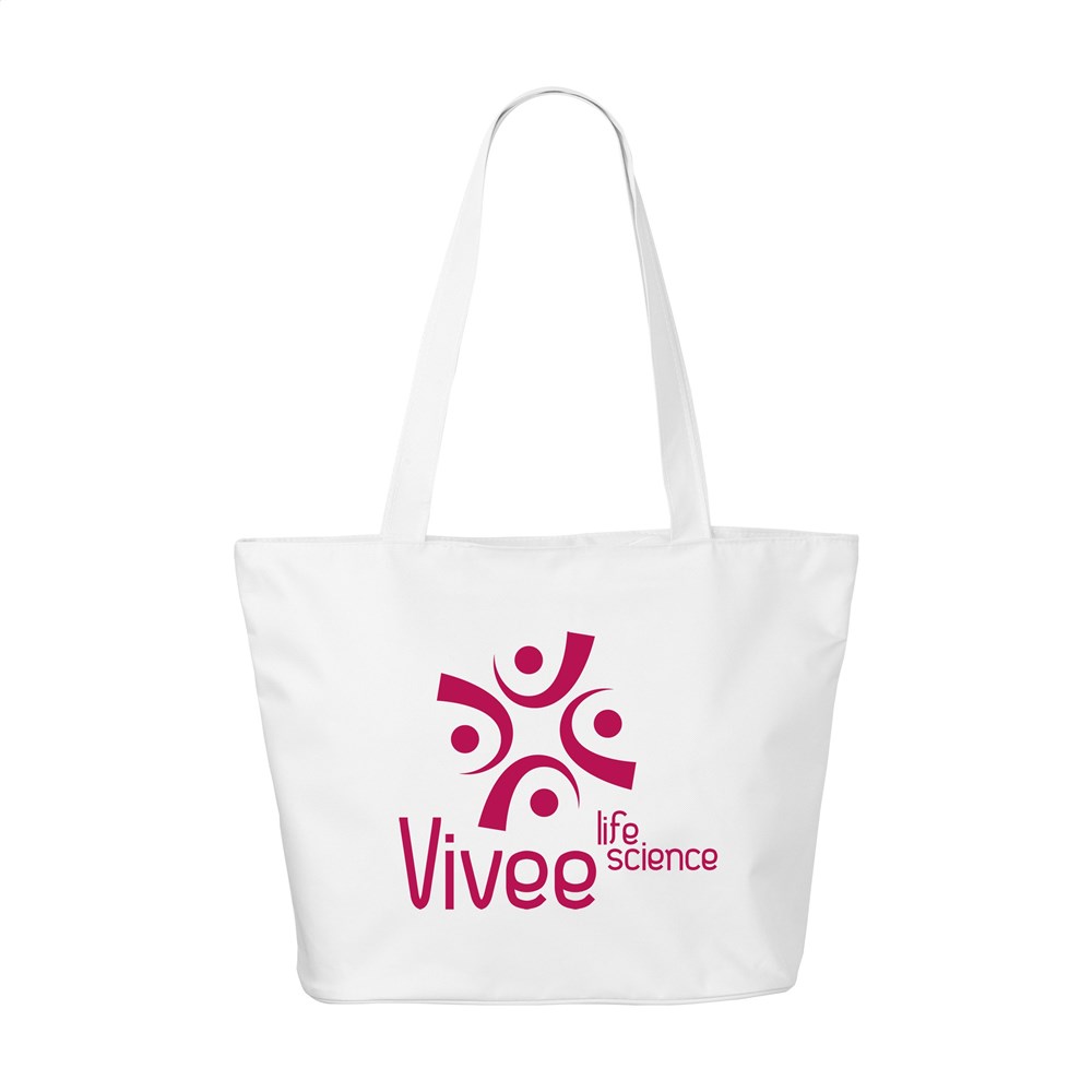 Prachtige, stevige tas van 600D polyester met verstevigde binnenzijde, lange hengsels, ritssluiting en opbergvakje met rits. De brede bodem is aan de buitenzijde mooi en strak afgewerkt met een ronde bies. Multifunctioneel in te zetten als shopper, boodschappentas en strandtas.
