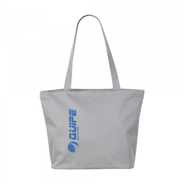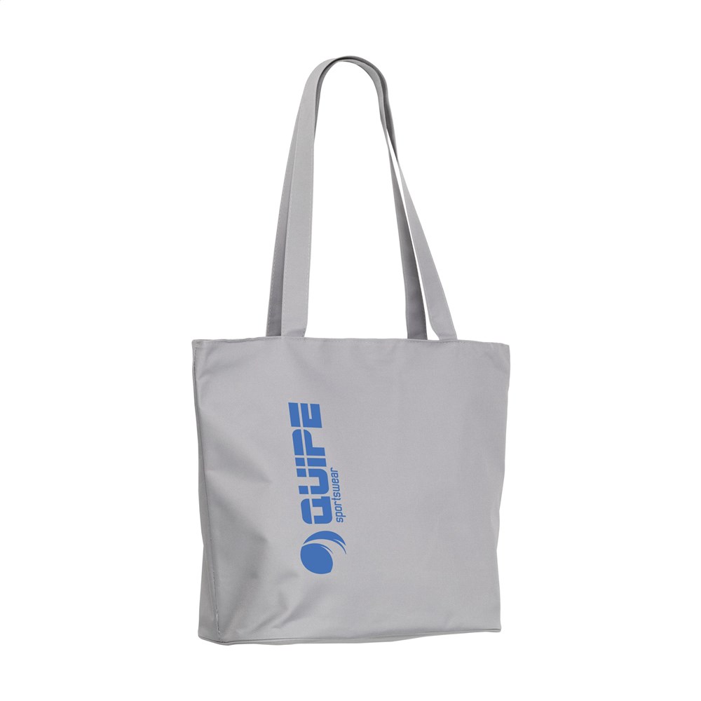 Prachtige, stevige tas van 600D polyester met verstevigde binnenzijde, lange hengsels, ritssluiting en opbergvakje met rits. De brede bodem is aan de buitenzijde mooi en strak afgewerkt met een ronde bies. Multifunctioneel in te zetten als shopper, boodschappentas en strandtas.
