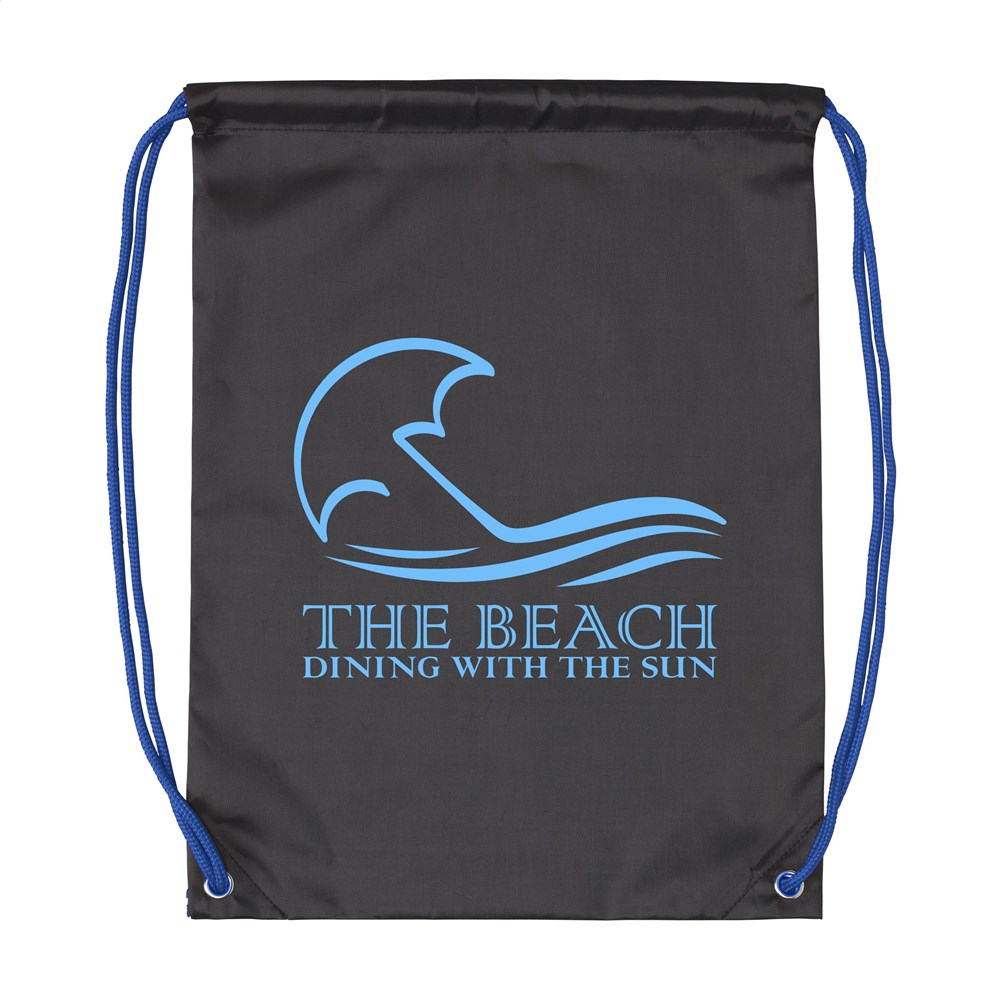 Rugzak van waterafstotend 210D polyester. Met gekleurde aanrijgkoorden. Inhoud ca. 8 liter.