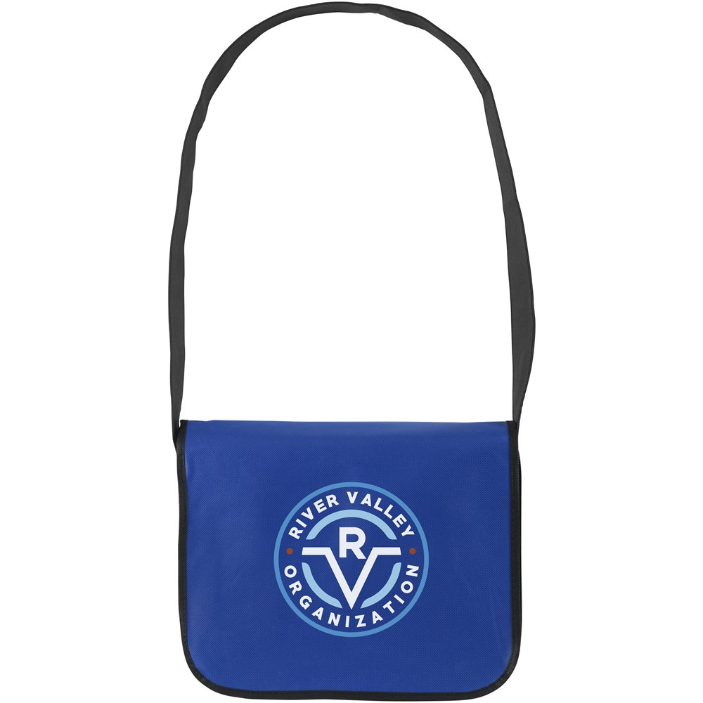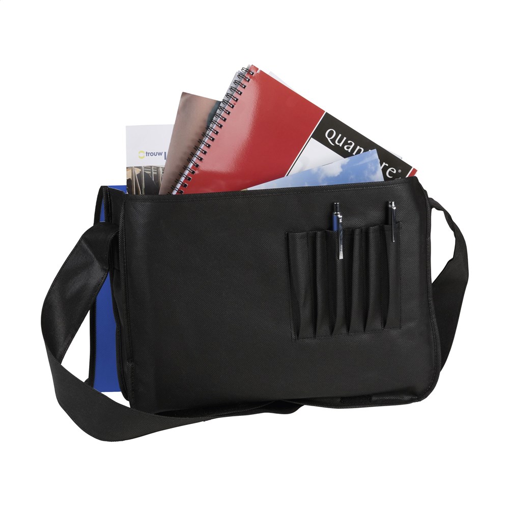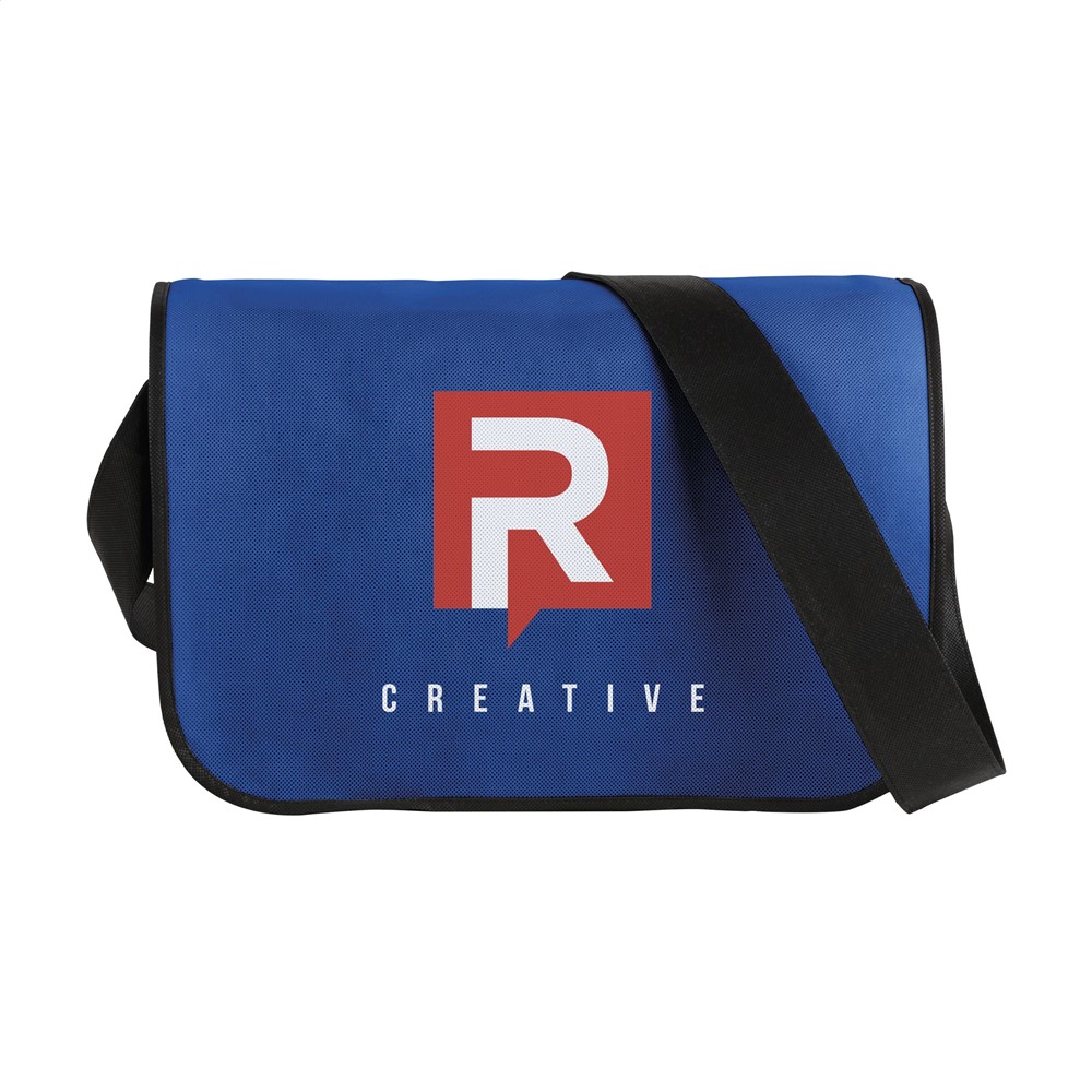 Praktische nonwoven (120 g/m²) schoudertas in handig formaat. Superlicht en sterk. Met ruim hoofdvak, insteekvakjes voor balpennen, schouderriem en overslag met klittenbandsluiting.