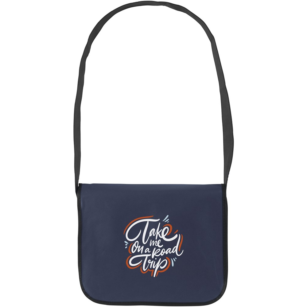 Praktische nonwoven (120 g/m²) schoudertas in handig formaat. Superlicht en sterk. Met ruim hoofdvak, insteekvakjes voor balpennen, schouderriem en overslag met klittenbandsluiting.