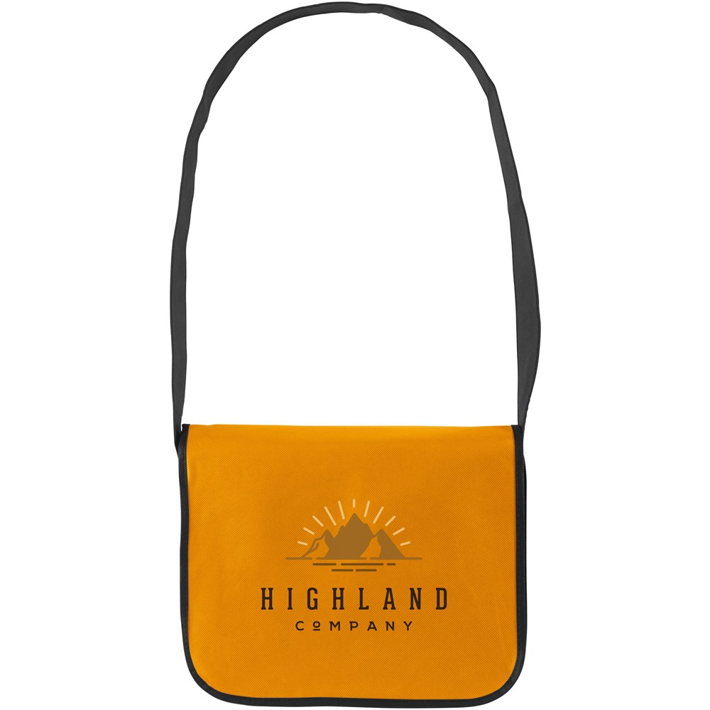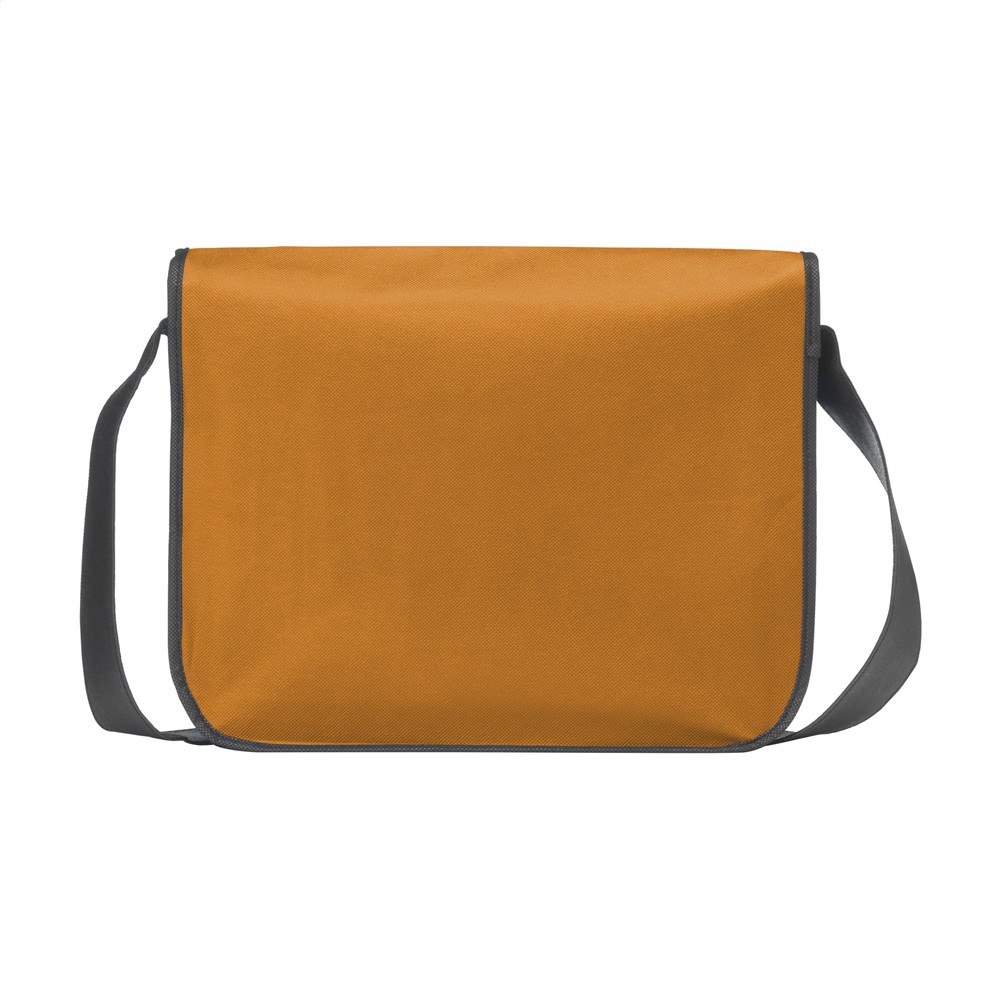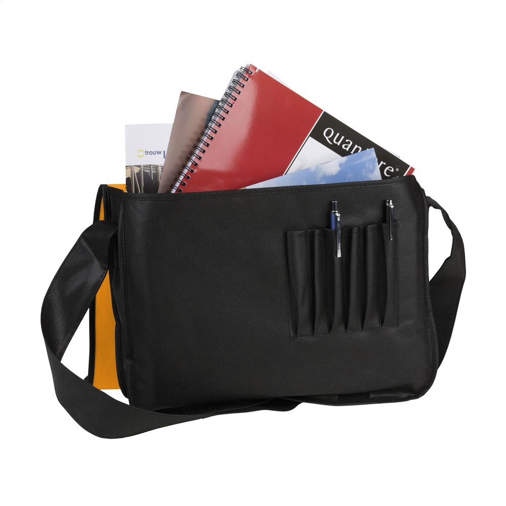 Praktische nonwoven (120 g/m²) schoudertas in handig formaat. Superlicht en sterk. Met ruim hoofdvak, insteekvakjes voor balpennen, schouderriem en overslag met klittenbandsluiting.
