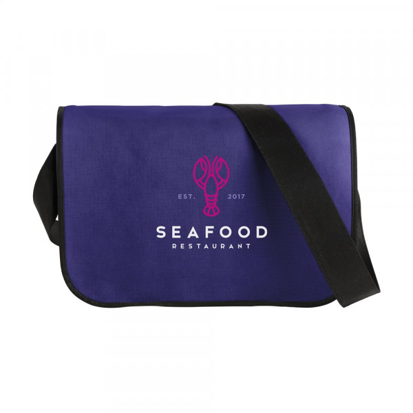 Praktische nonwoven (120 g/m²) schoudertas in handig formaat. Superlicht en sterk. Met ruim hoofdvak, insteekvakjes voor balpennen, schouderriem en overslag met klittenbandsluiting.