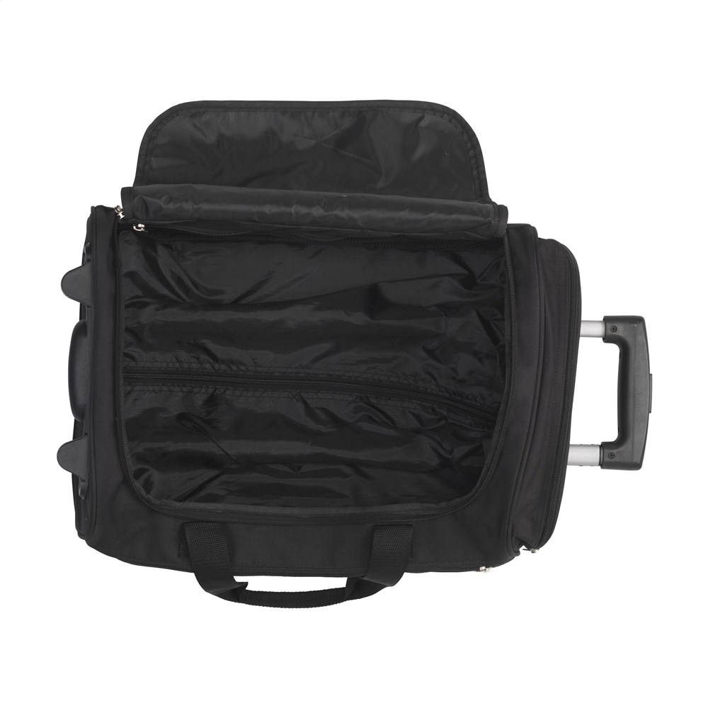 Praktische, cabine goedgekeurde, 18” trolley-/weekendtas van 600D polyester. Met uitschuifbare handgreep, 2 wielen, draaglussen en een handgreep. Dit biedt de mogelijkheid om de tas op verschillende manieren te vervoeren. De tas heeft een royaal hoofdvak, 2 ritsvakken en een gaasvak met rits aan de binnenzijde. Inhoud ca. 35 liter.