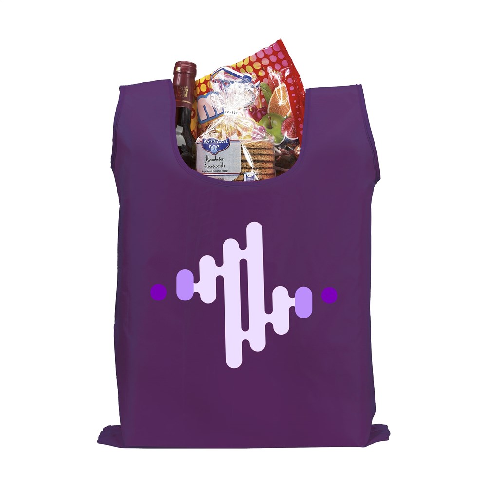 Opvouwbare winkeltas van 190T polyester. In etui met drukknoop en karabijnhaak. Afm. uitgevouwen 53 x 38 cm.