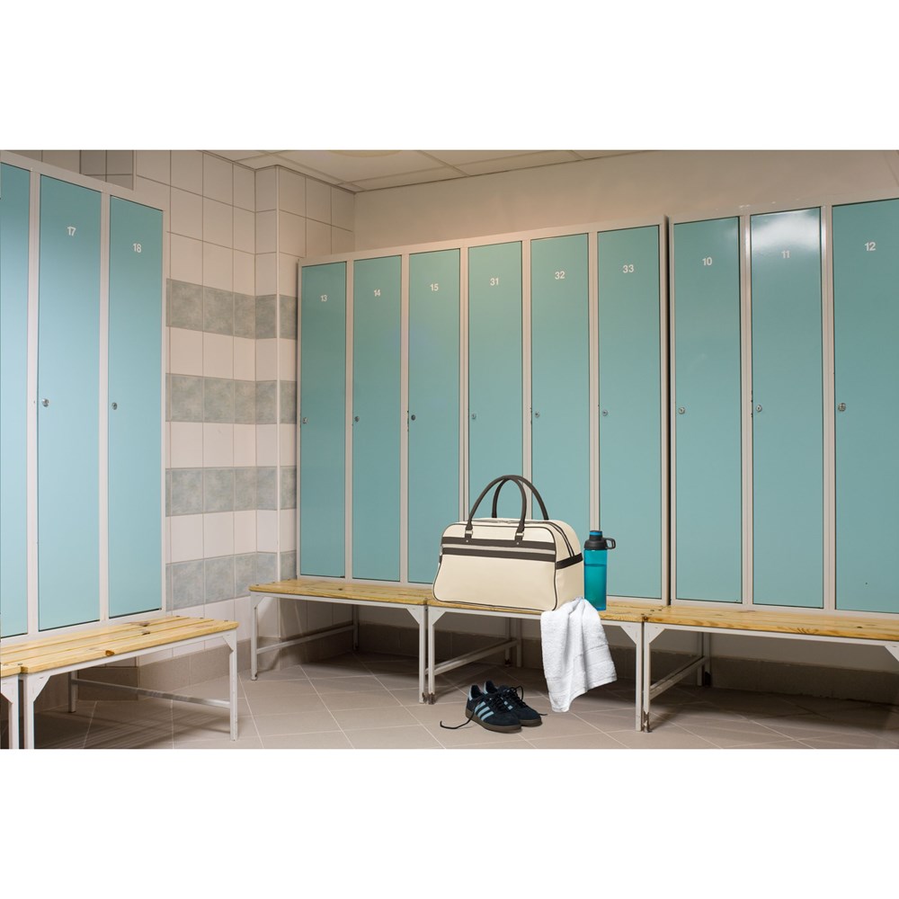 PVC/PU sporttas in jaren '70 look met gevoerde binnenzijde, hoofdvak en ritsvak, 2 stevige handgrepen, inlegbodem en beschermnoppen. Afgewerkt met hoogwaardige materialen die een lange levensduur garanderen. Inhoud 21,5 ltr.