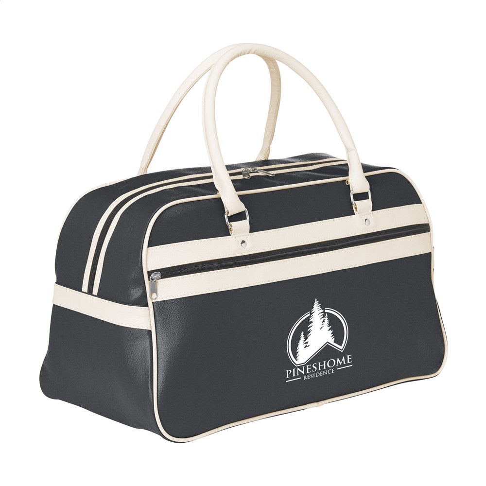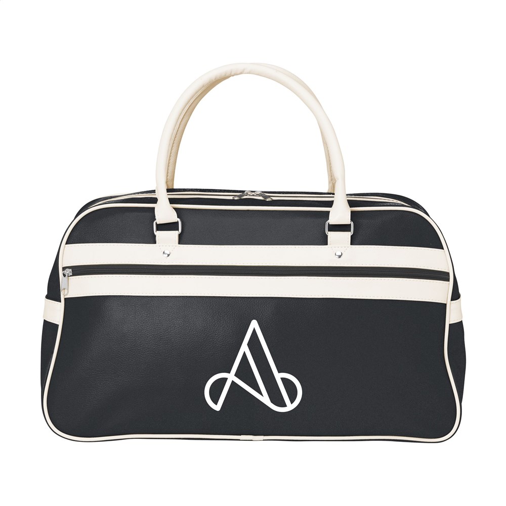 PVC/PU sporttas in jaren '70 look met gevoerde binnenzijde, hoofdvak en ritsvak, 2 stevige handgrepen, inlegbodem en beschermnoppen. Afgewerkt met hoogwaardige materialen die een lange levensduur garanderen. Inhoud 21,5 ltr.