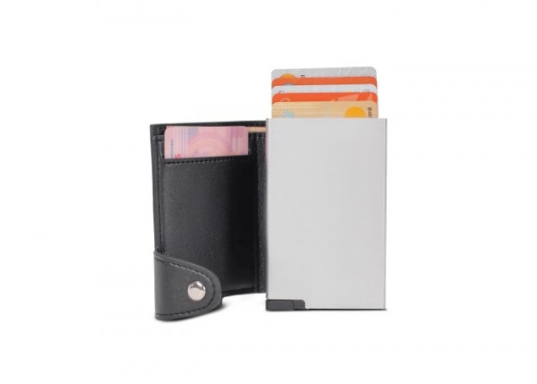 Uniek design aluminium kaarthouder met leerlook hoesje. De kaarthouder beschermt (bank)passen tegen RFID skimming. Druk op de knop en zes kaarten (vier met verdikte letters) komen getrapt uit de houder. Het hoesje biedt plaats aan een extra (bank)pas en bankbiljetten