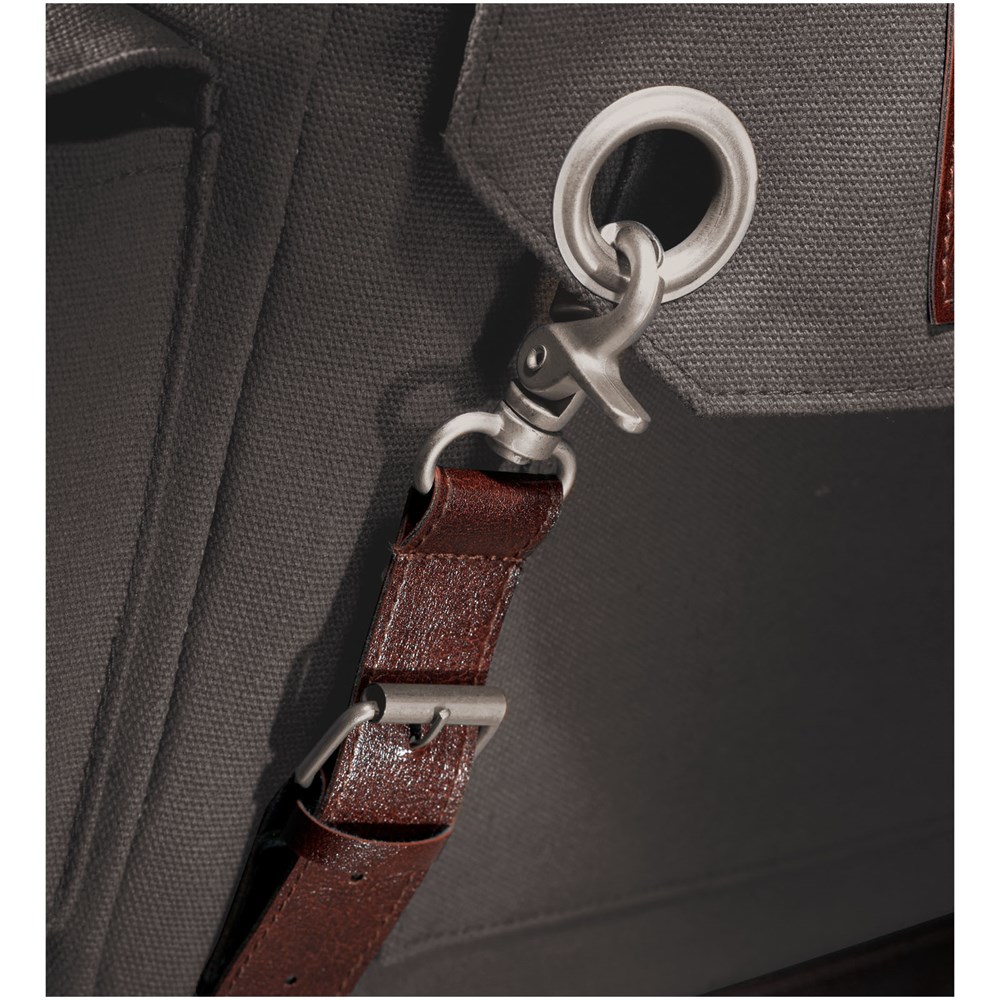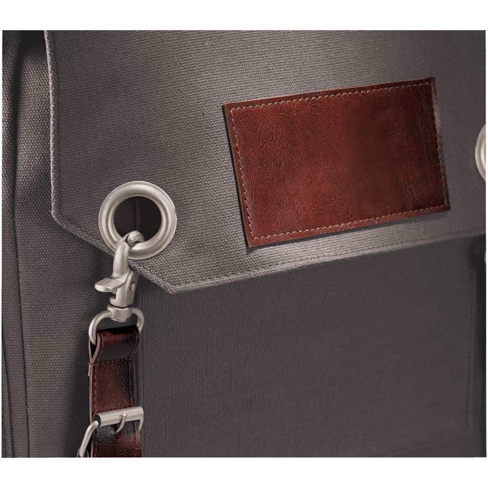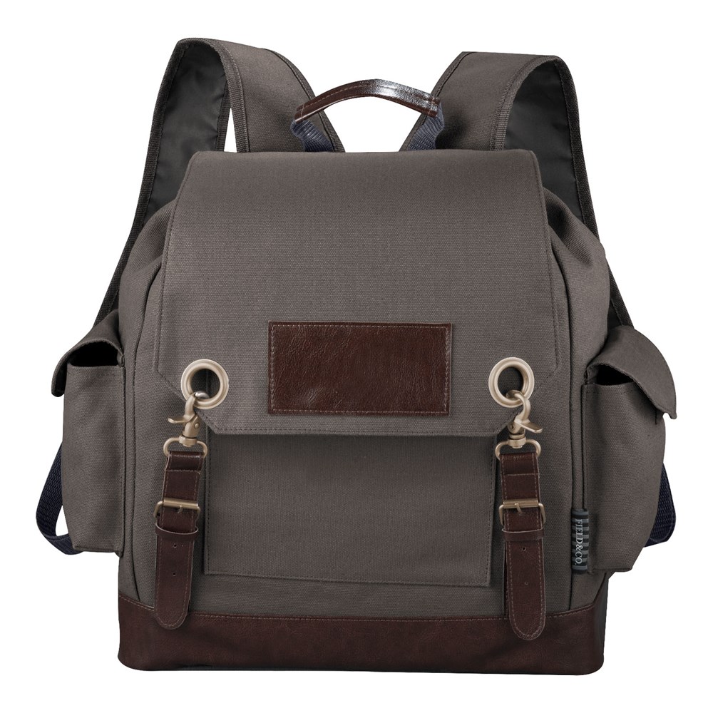 Rugzak met exclusief design en open hoofdvak met trekkoordsluiting. Beschermende flap wordt gesloten met dofzilveren gespen. Open voorvak met penlus. Zijvakken met flappen met klittenbandsluiting. Verstelbare schouderbanden en handgreep. Unieke vintage merkelementen en hardware van Field & Co.™.