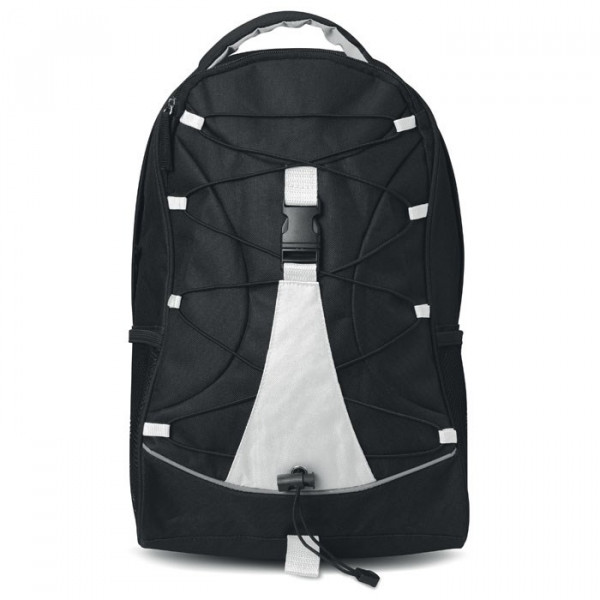 Zwarte rugzak met gekleurde accenten. Met trekkoord en zijvakken, 600D polyester.