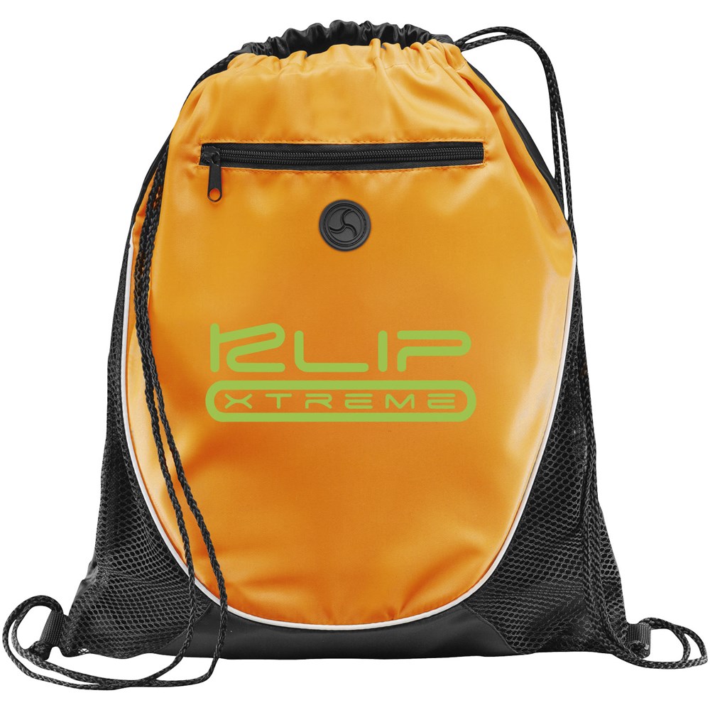Polyester tas met hoofdvak en trekkoordsluiting. Voorvak met ritssluiting en oortelefoondoorgang. Oordopjes niet inbegrepen.