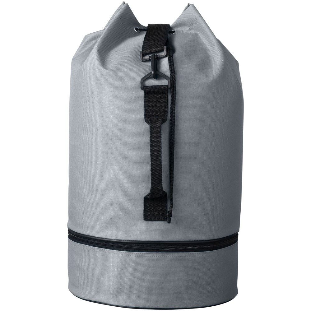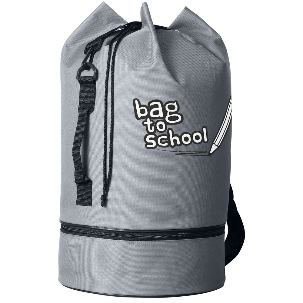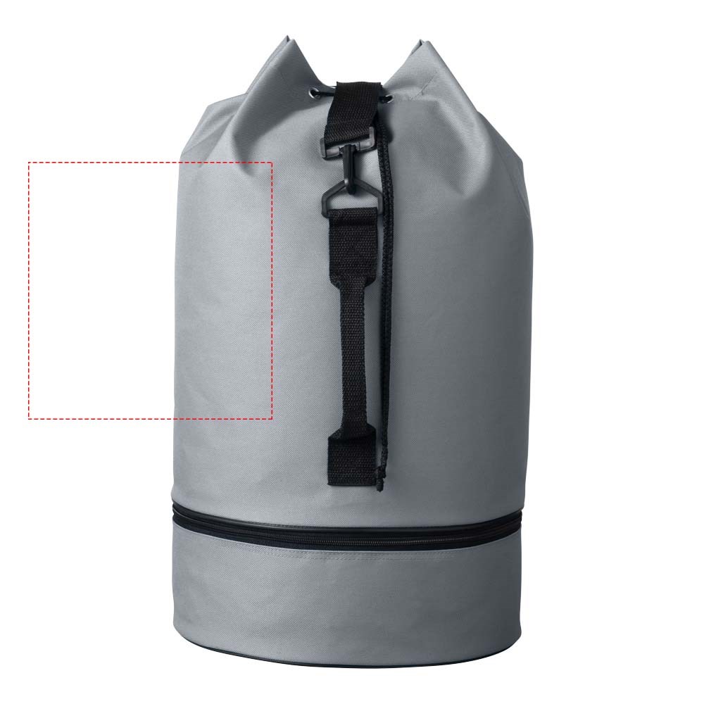 Plunjezak met trekkoordsluiting, zijgreep en verstelbare schouderband. Apart ondervak met rits.