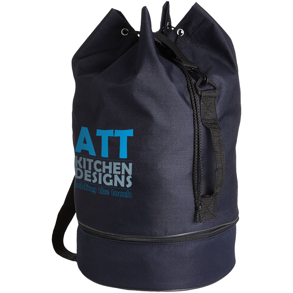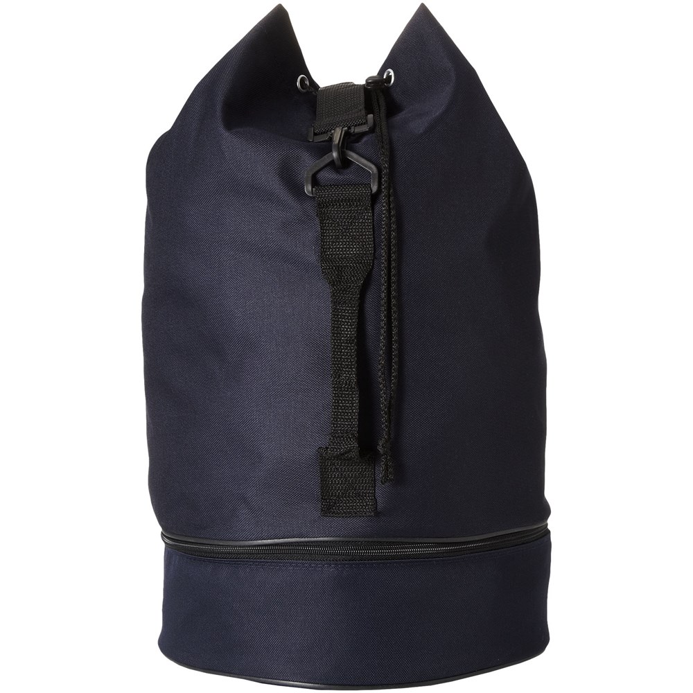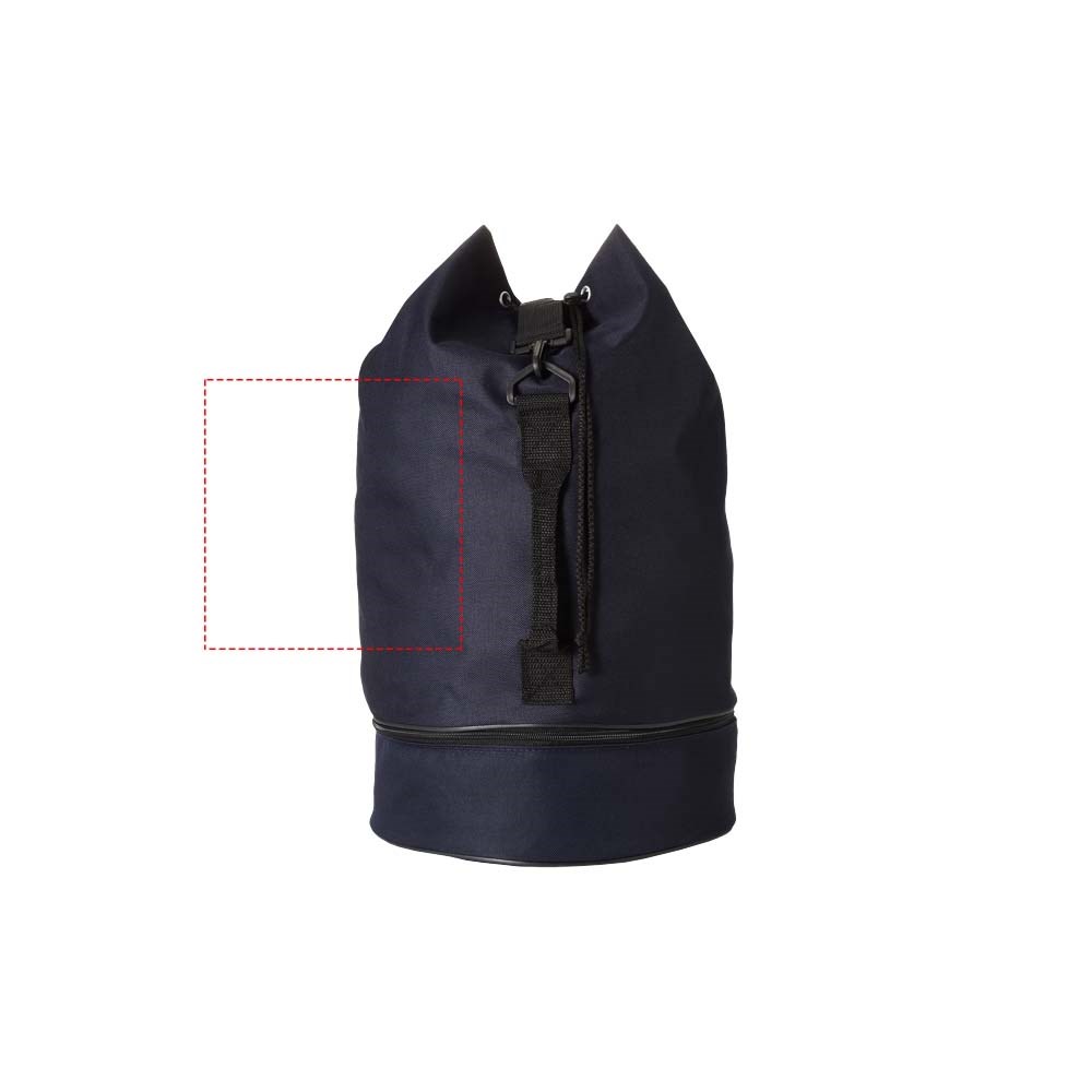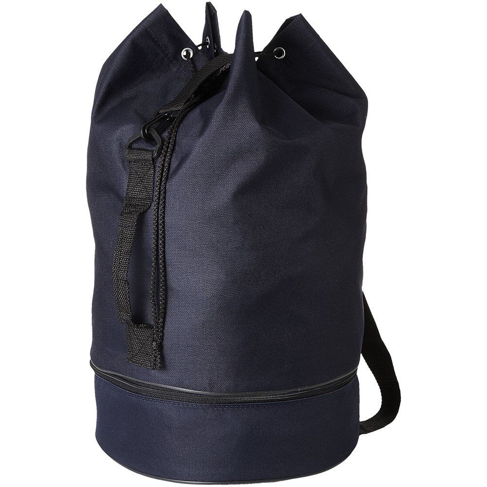 Plunjezak met trekkoordsluiting, zijgreep en verstelbare schouderband. Apart ondervak met rits.