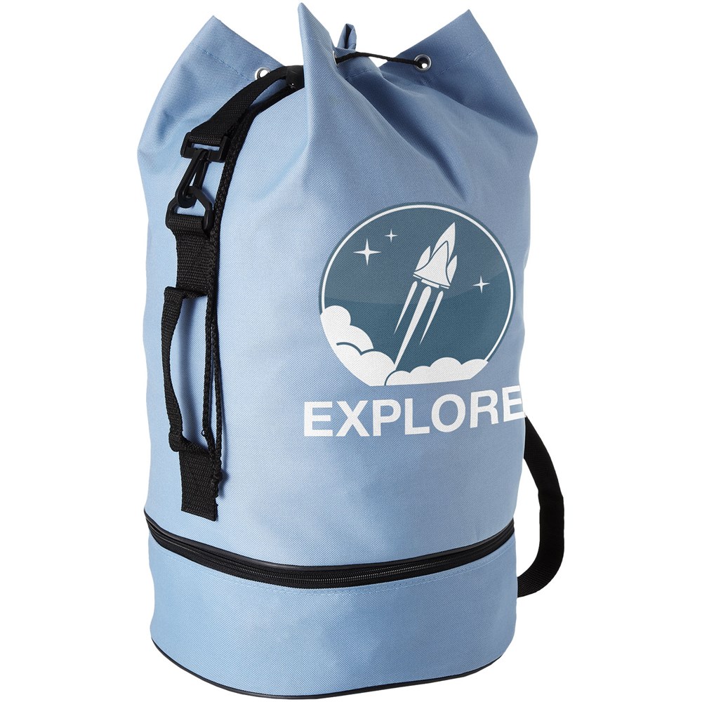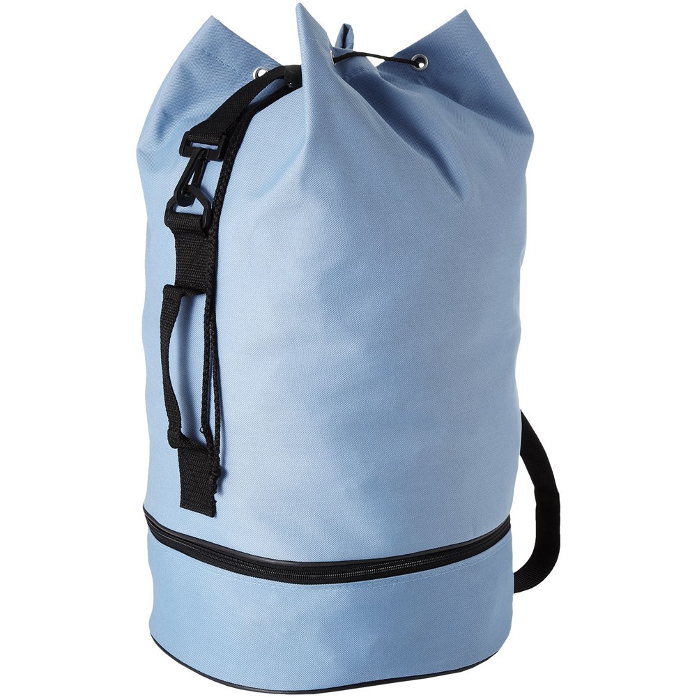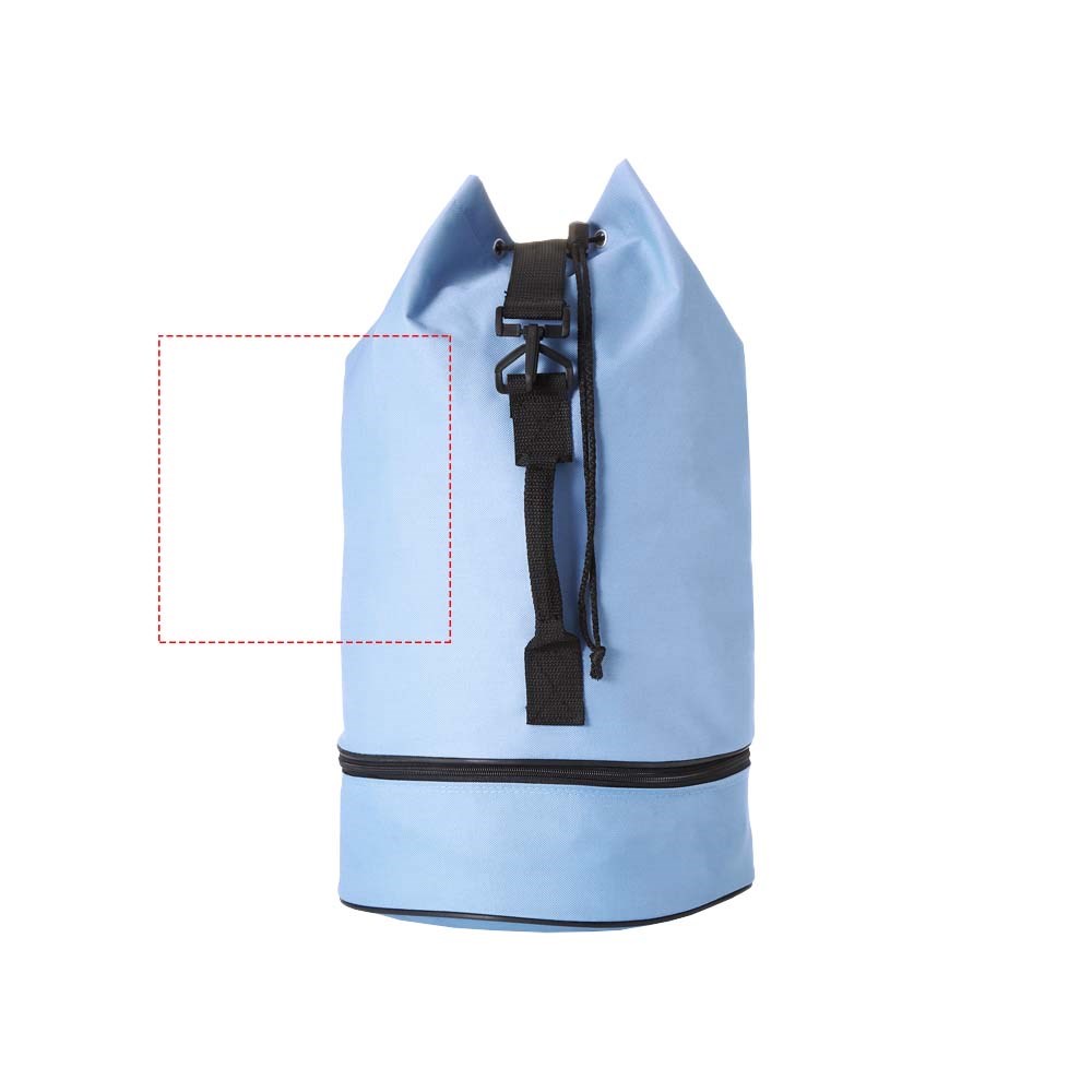 Plunjezak met trekkoordsluiting, zijgreep en verstelbare schouderband. Apart ondervak met rits.