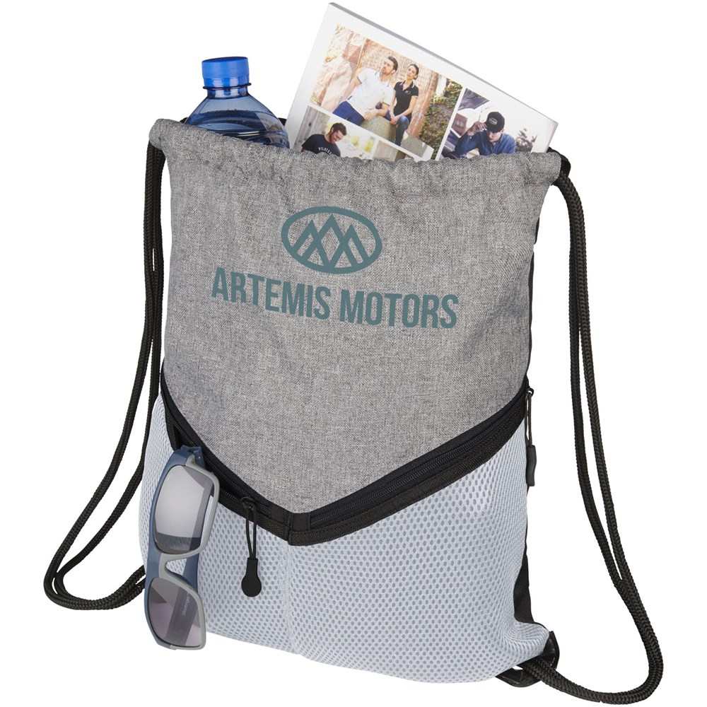 Een sportieve rugzak met een koordsluiting, groot hoofdvak en twee meshvakken met rits.