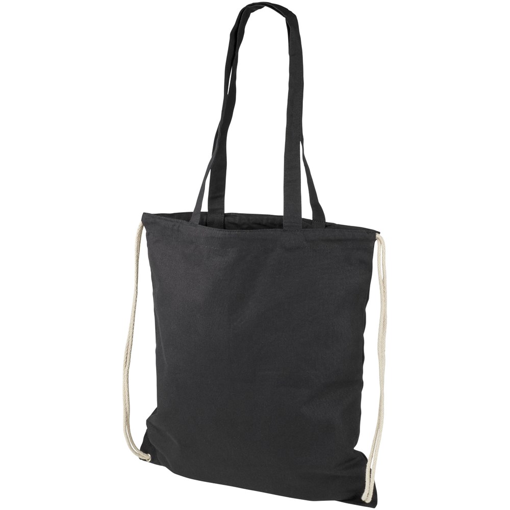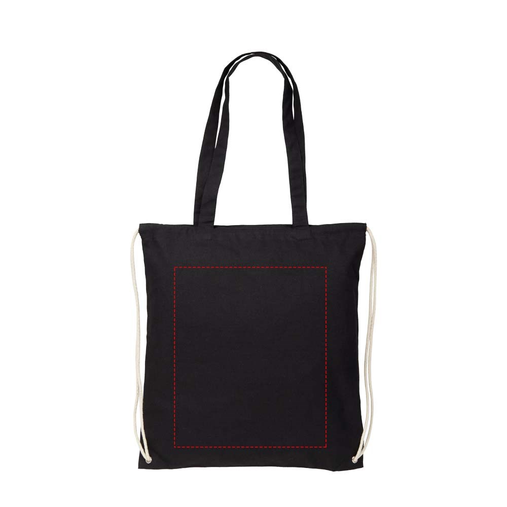 Multifunctionele katoenen tas met lange handgrepen en trekkoord die als schoudertas of rugzak kan worden gedragen. Groot hoofdvak met trekkoordsluiting. Voorzien van twee uitklapbare handgrepen met een lengte van 31 cm. Capaciteit: 1,5 l, weerstand tot 5 kg gewicht.