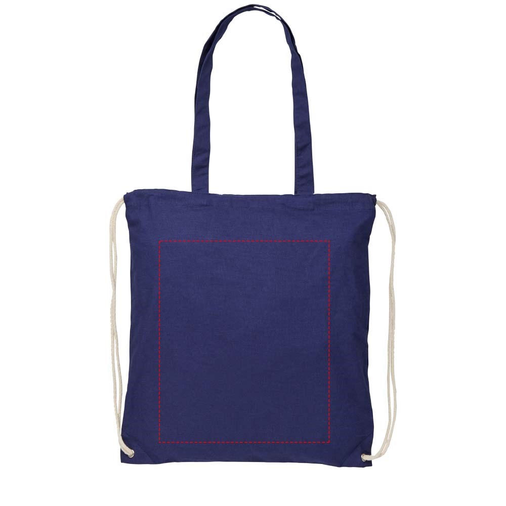 Multifunctionele katoenen tas met lange handgrepen en trekkoord die als schoudertas of rugzak kan worden gedragen. Groot hoofdvak met trekkoordsluiting. Voorzien van twee uitklapbare handgrepen met een lengte van 31 cm. Capaciteit: 1,5 l, weerstand tot 5 kg gewicht.
