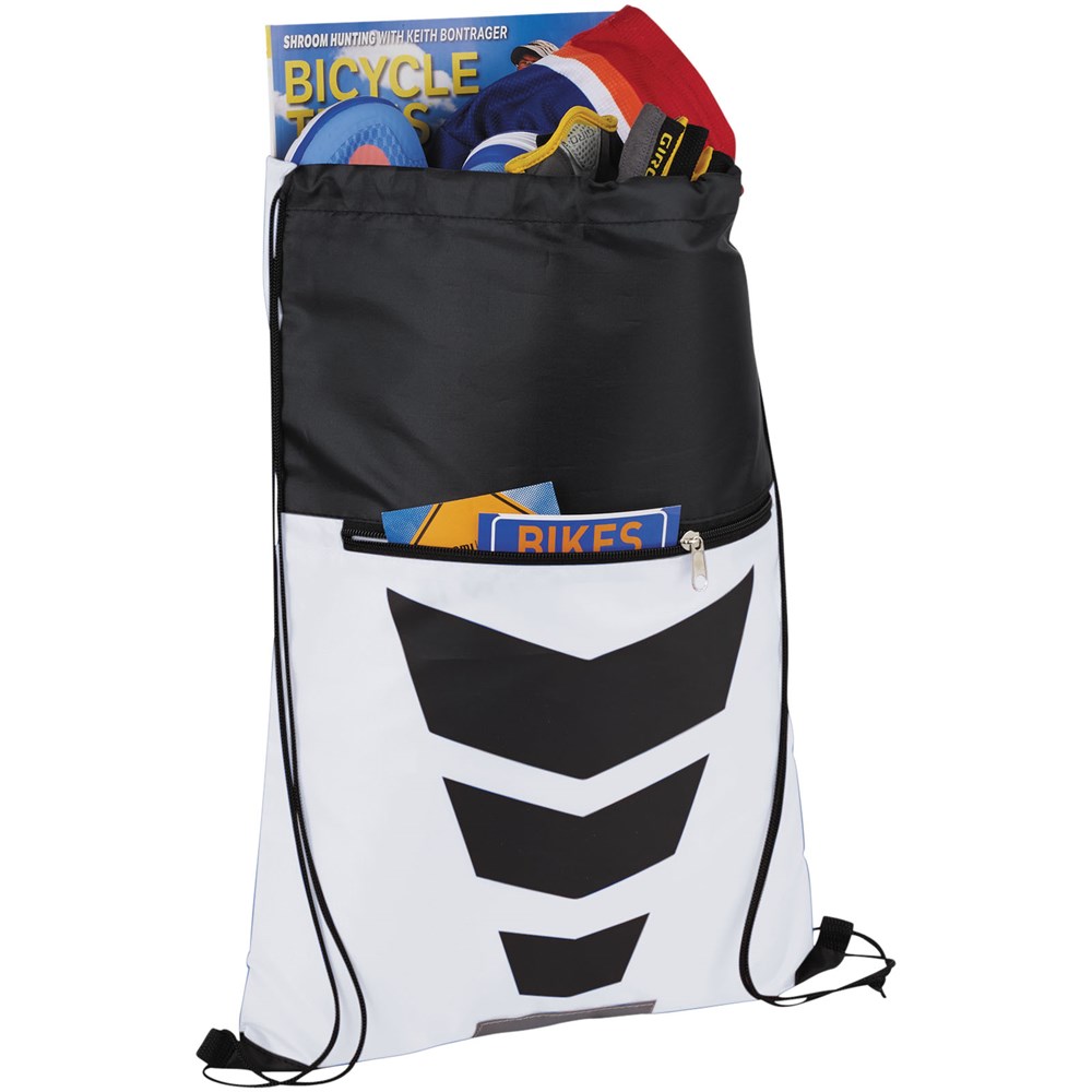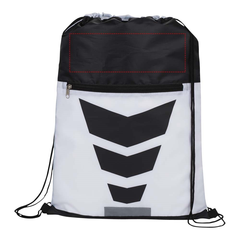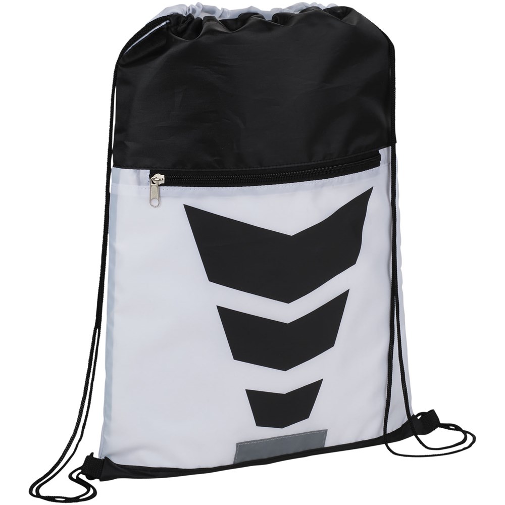 Deze polyester rugzak met trekkoordsluiting heeft een aantrekkelijk grafisch design met reflecterende accenten aan de voorzijde die extra zichtbaarheid geven bij nacht. Groot hoofdvak met trekkoordsluiting en extra voorvak met ritssluiting om je bezittingen in op te bergen.