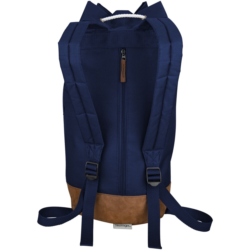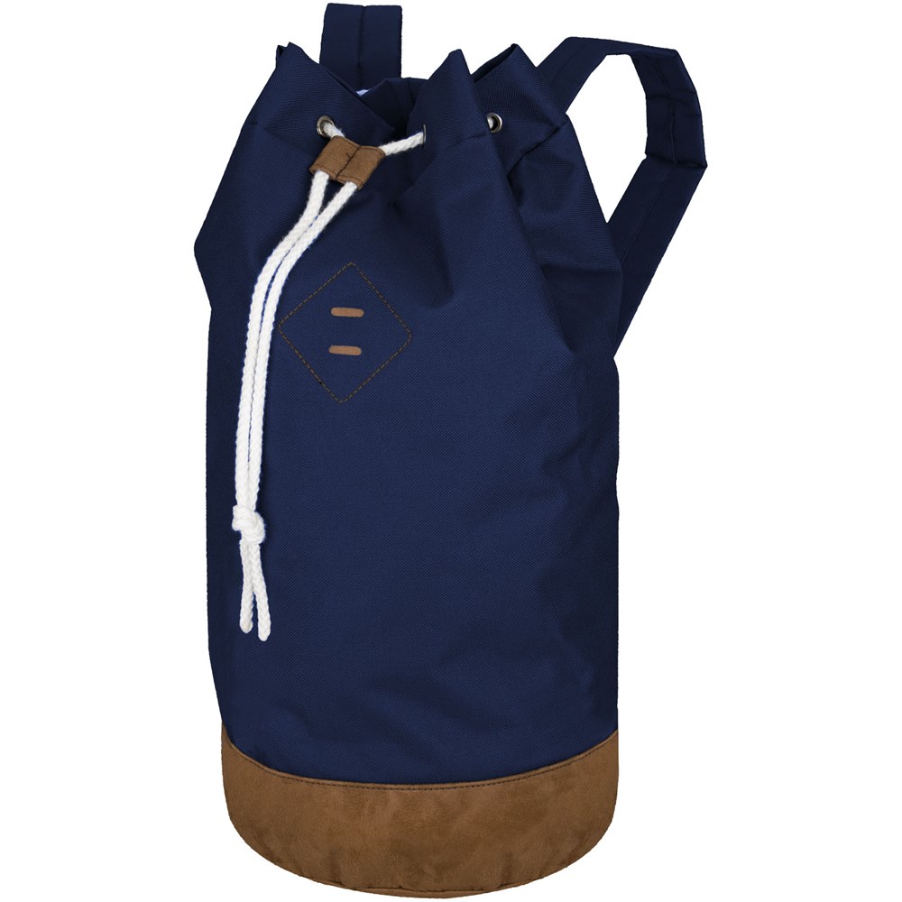 Rugzak met exclusief marineontwerp met een katoenen trekkoordsluiting en een verticale ritssluiting op de achterkant voor gemakkelijke toegang. Met extra flap onder de trekkoordsluiting voor extra bescherming van uw bezittingen. Het voorvak heeft een 'pig snout' voor het bevestigen van kleine accessoires zoals sleutelhangers of een karabijnhaak. Twee verstelbare gewatteerde schouderriemen.