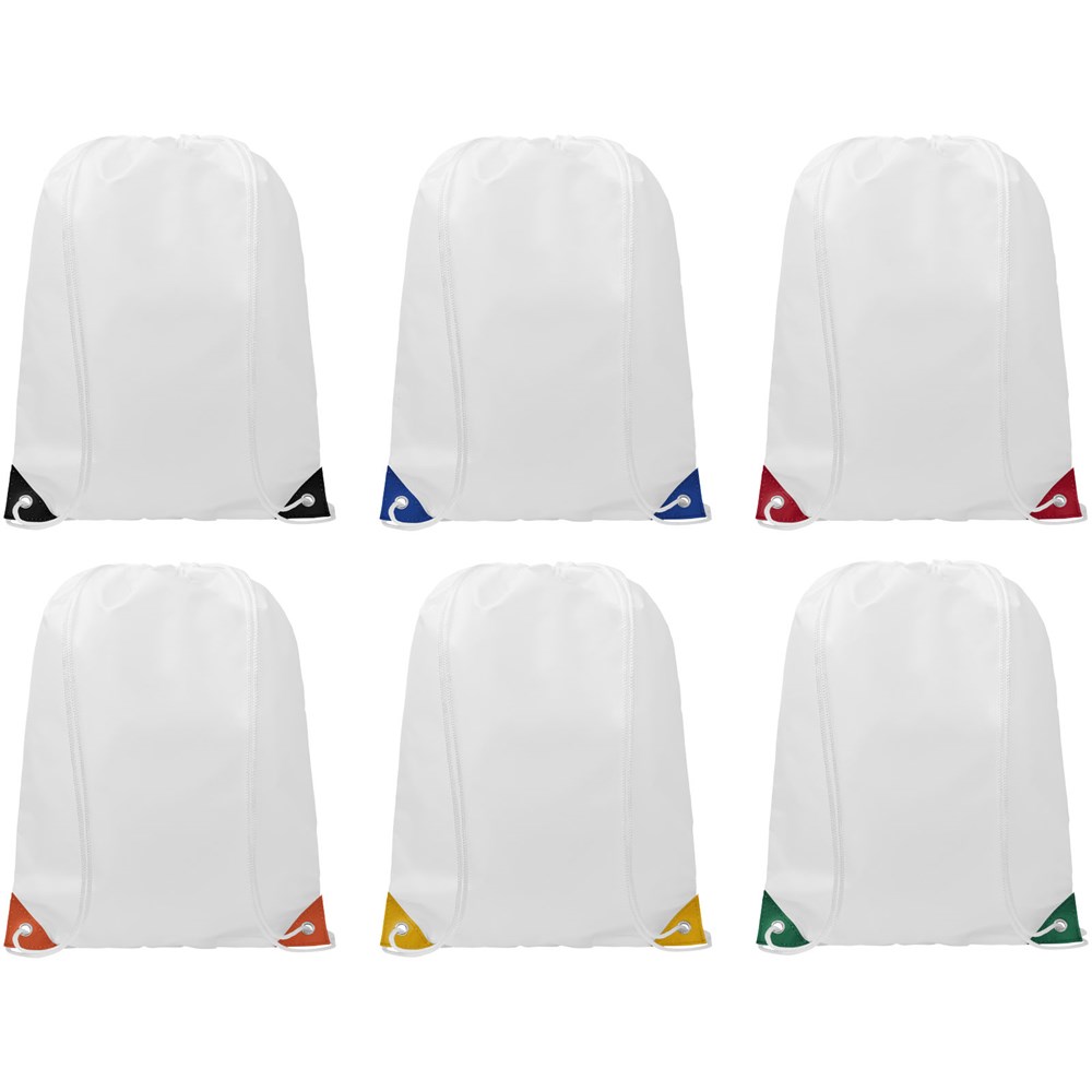 Rugzak met hoofdvak met trekkoordsluiting in witte kleur. Voorzien van gekleurde en versterkte hoeken. Geschikt voor een gewicht tot 5 kg.