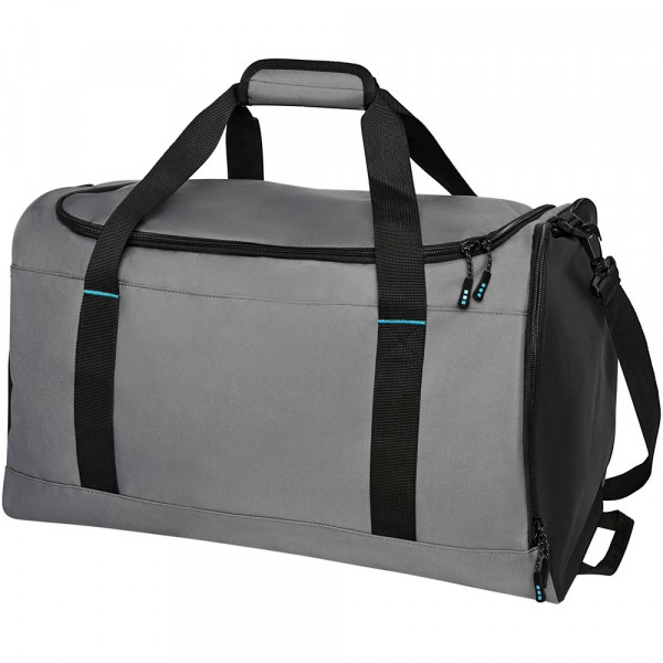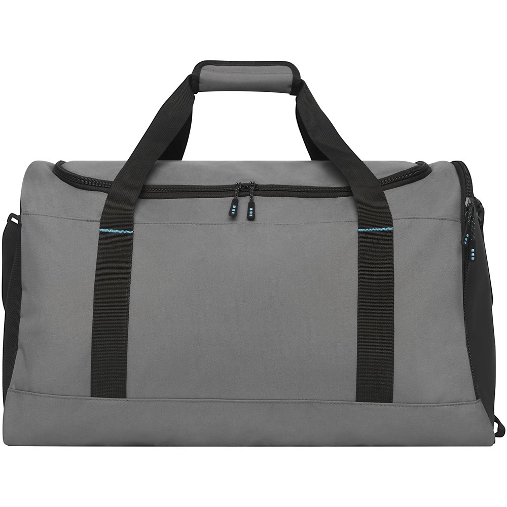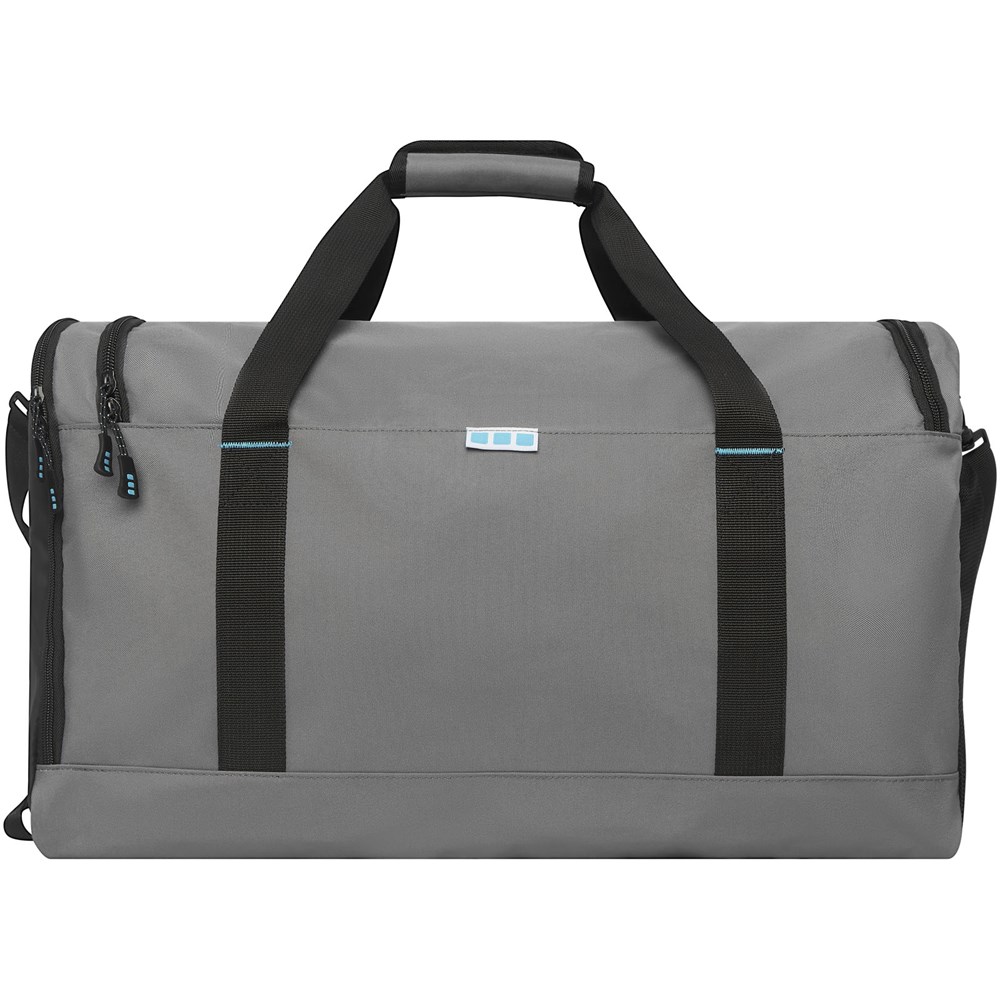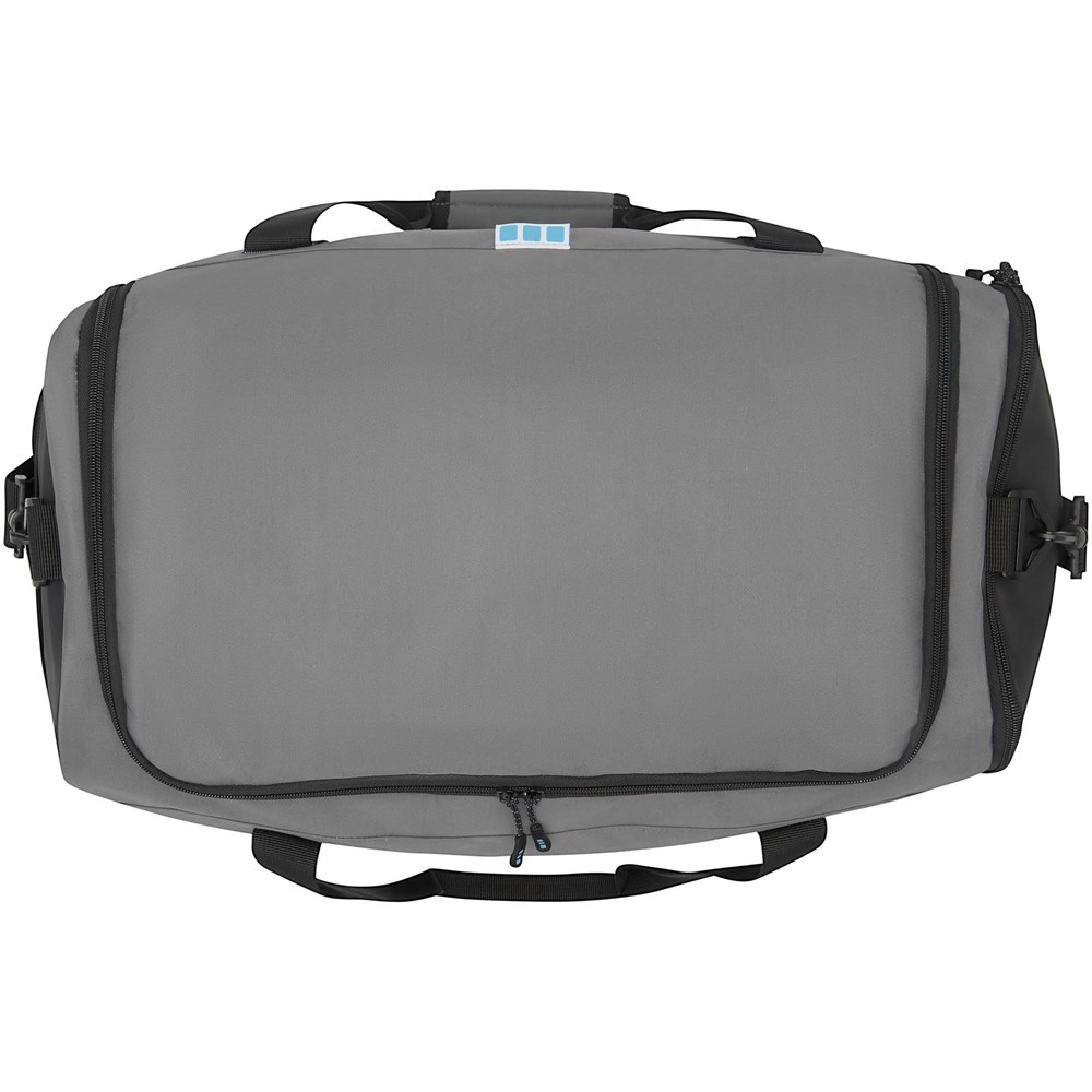 Duurzame GRS-gecertificeerde RPET duffeltas gemaakt met 55% gerecyclede materialen. Voorzien van een groot hoofdvak met rits, een versterkt basispaneel, een mesh zijvak en een uitbreidbaar vak met rits voor de scheiding van natte en droge kleding. Wordt geleverd met een klein binnenvak met rits voor organisatie, verwijderbare en gewatteerde schouderband, hengsels met gewatteerde klittenbandsluiting, en een extra hengsel aan de rechter onderkant.