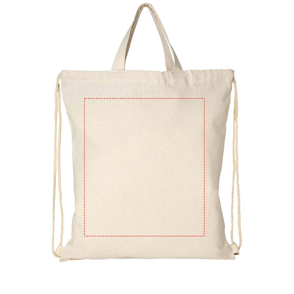 Trekkoordrugzak van 210 g/m² gerecycled katoen-polyester mix. Gerecycled katoen wordt vervaardigd uit voor consumenten bestemd afval dat in textielfabrieken tijdens het snijproces wordt geproduceerd. Groot hoofdvak met katoenen trekkoordsluiting. Voorzien van twee handgrepen met een valhoogte van 14 cm. Geschikt voor een gewicht tot 5 kg.