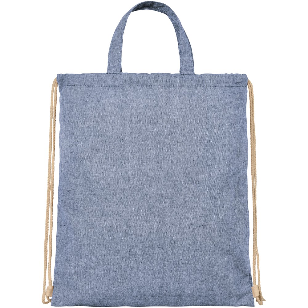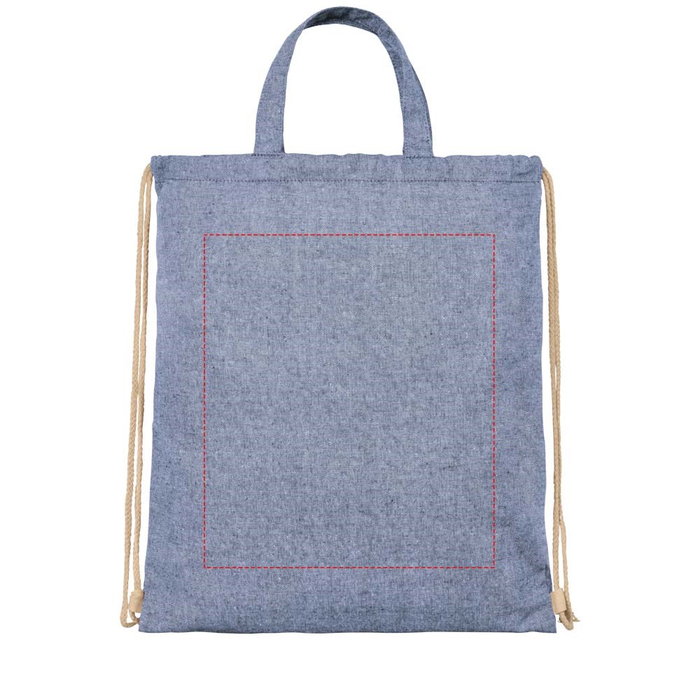 Trekkoordrugzak van 210 g/m² gerecycled katoen-polyester mix. Gerecycled katoen wordt vervaardigd uit voor consumenten bestemd afval dat in textielfabrieken tijdens het snijproces wordt geproduceerd. Groot hoofdvak met katoenen trekkoordsluiting. Voorzien van twee handgrepen met een valhoogte van 14 cm. Geschikt voor een gewicht tot 5 kg.