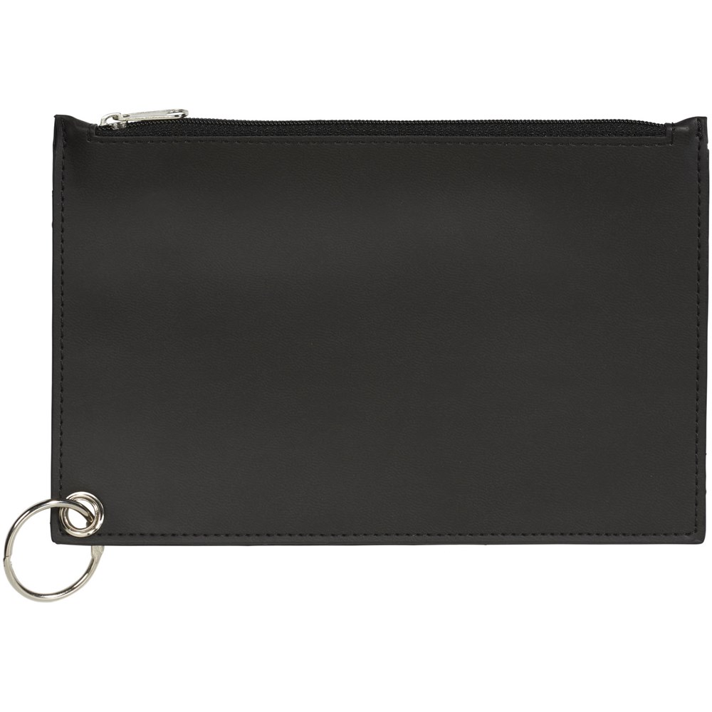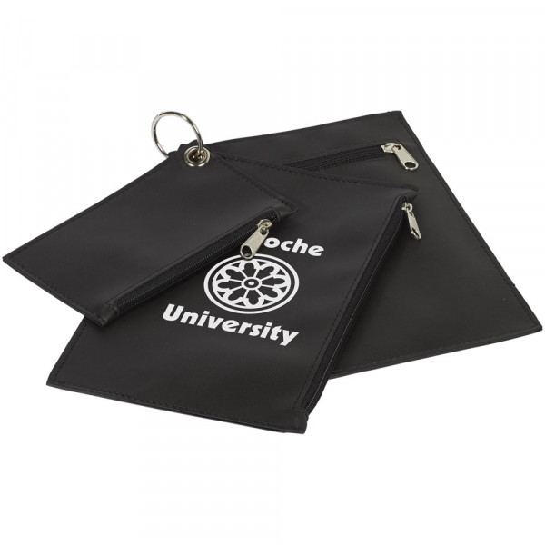Drie PU tasjes met ritssluiting, bijeengehouden door een sleutelring. Afmetingen van het kleine tasje: 12,5 cm x 7,5 cm. Tasje met lange ritssluiting: 19 cm x 12,4 cm. Tasje met korte ritssluiting: 19 cm x 12,4 cm.
