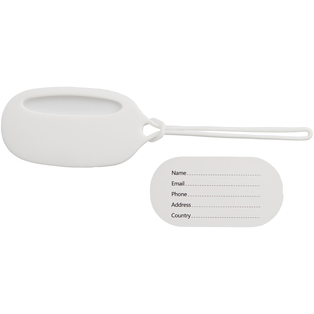 Reislabel met bijpassende siliconen sluiting. Op de ID-kaart binnenin kan naam, adres, telefoon, land en e-mail worden ingevuld.