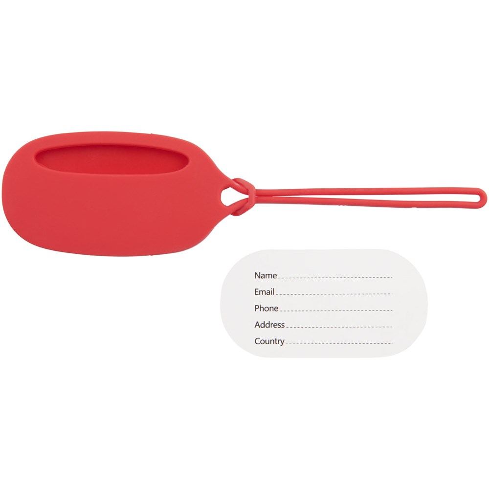Reislabel met bijpassende siliconen sluiting. Op de ID-kaart binnenin kan naam, adres, telefoon, land en e-mail worden ingevuld.