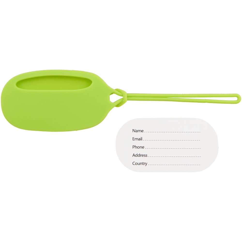 Reislabel met bijpassende siliconen sluiting. Op de ID-kaart binnenin kan naam, adres, telefoon, land en e-mail worden ingevuld.