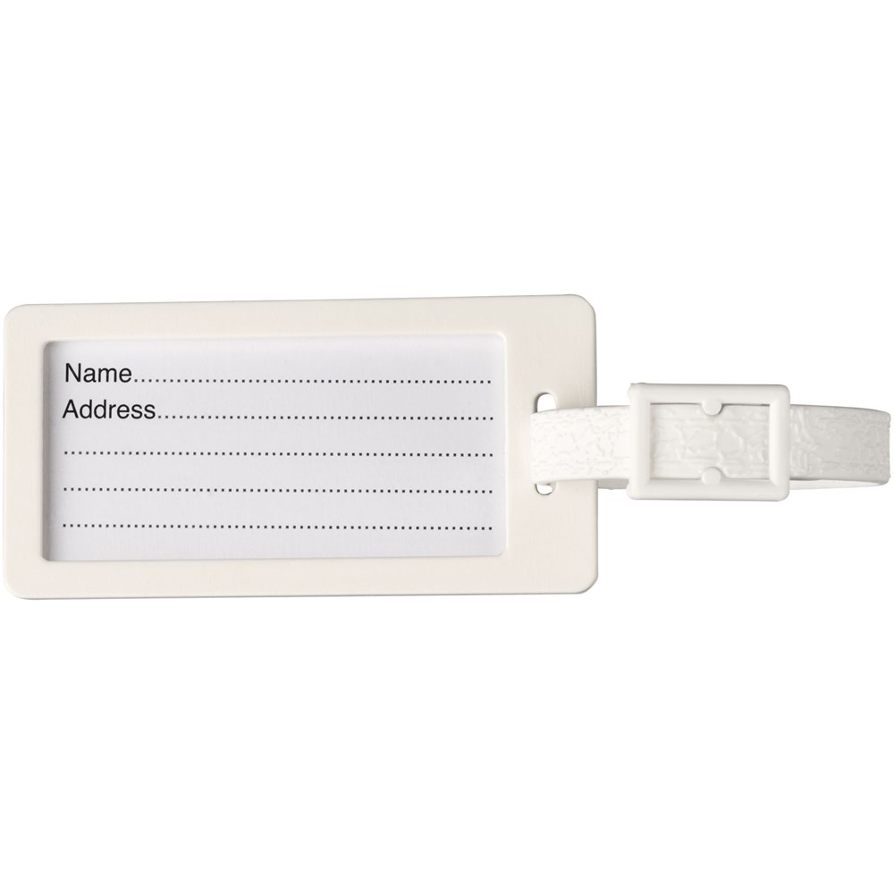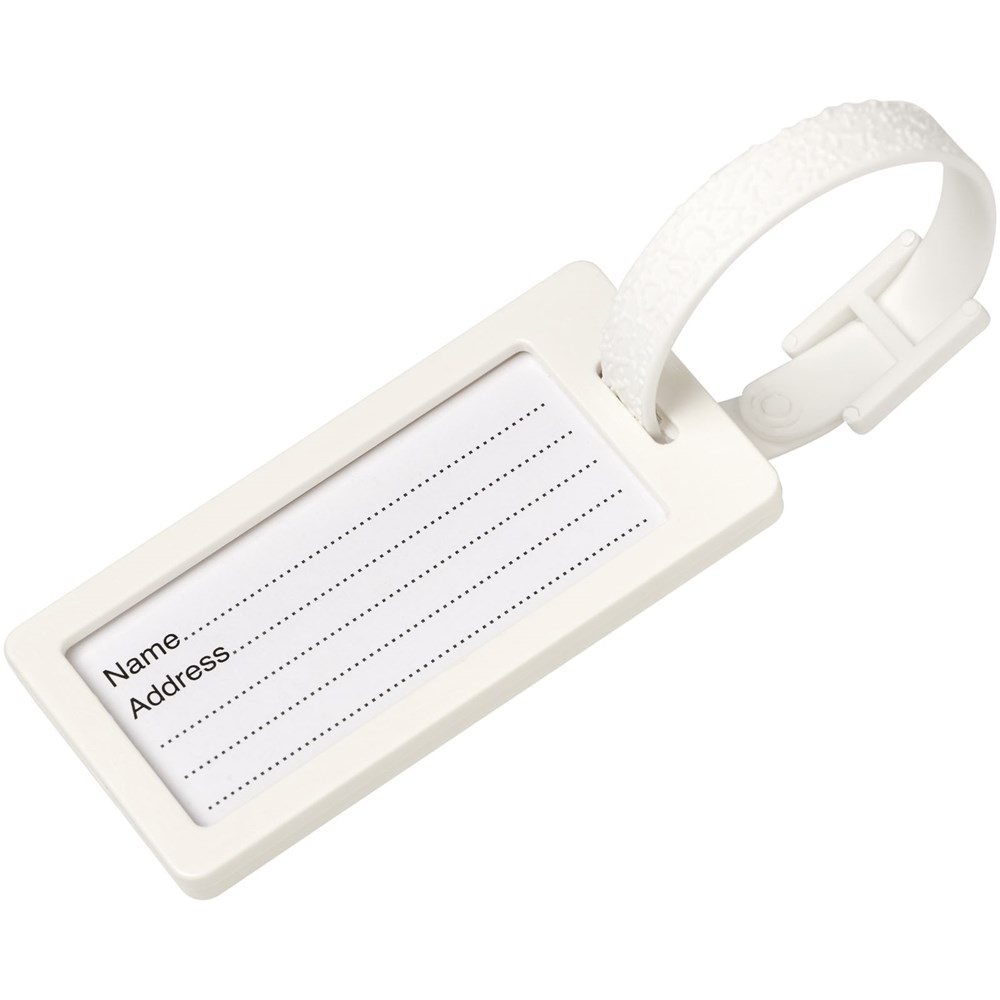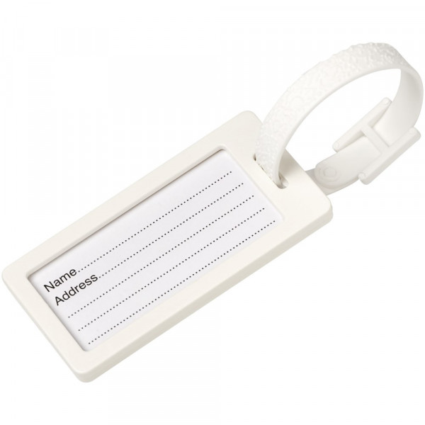 Een stevig bagagelabel compleet met papieren inlay, een doorzichtige beschermhoes en een bijpassend kunststof bandje.