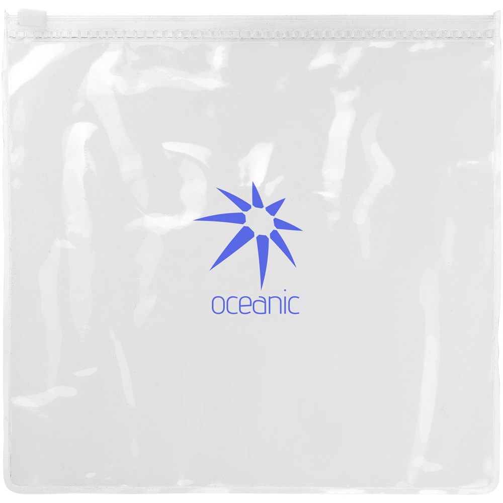 Reisset met oogmasker, oordopjes, nekkussen en reissokken, verpakt in een transparante hoes. Decoratie is niet mogelijk op de onderdelen, alleen op de hoes.