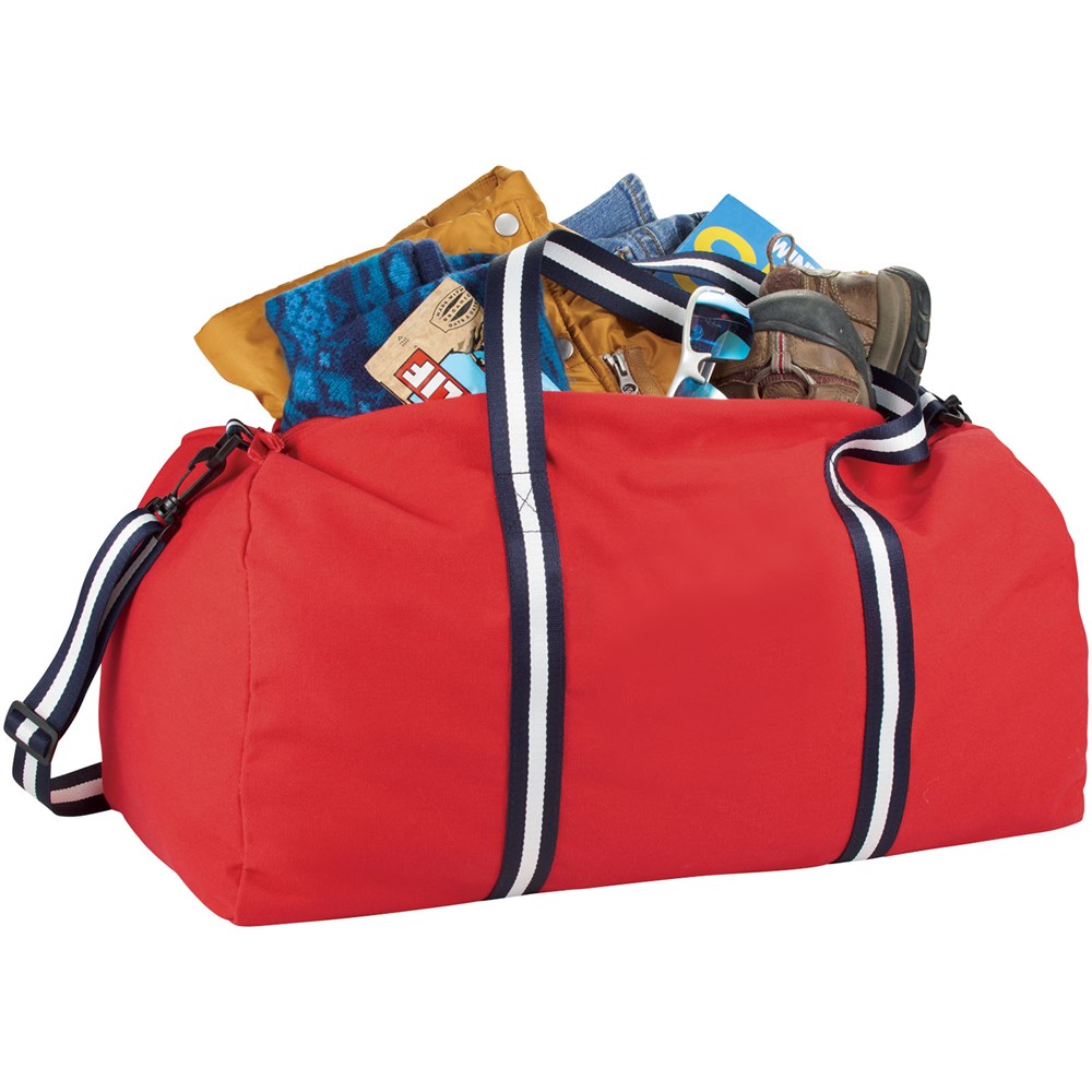 Deze katoenen tas is de perfecte reistas voor je volgende avontuur. De katoenen contrast-strepen geven deze klassieke tas een frisse look. Groot hoofdvak met ritssluiting. Afneembare verstelbare gestreepte katoenen schouderband.