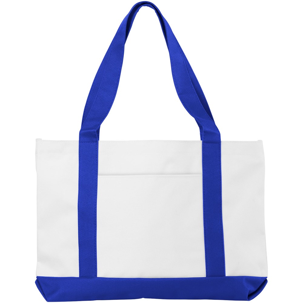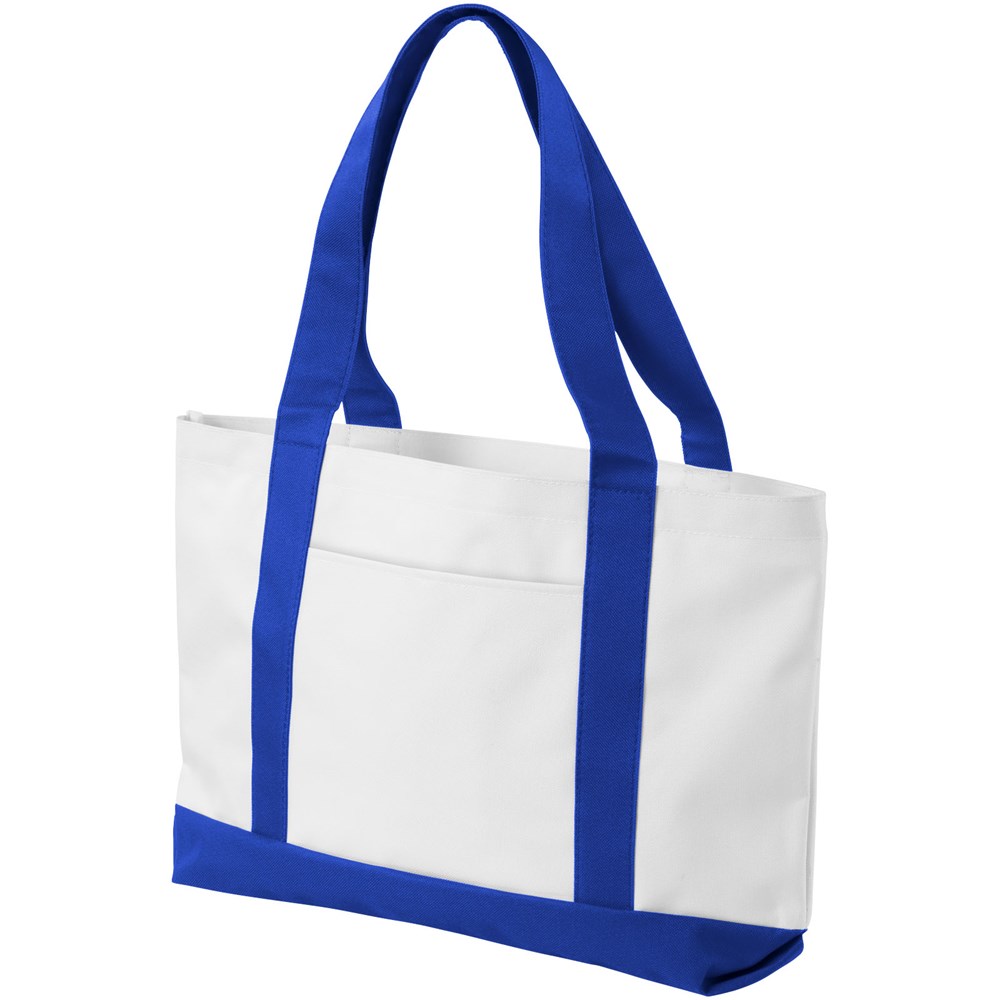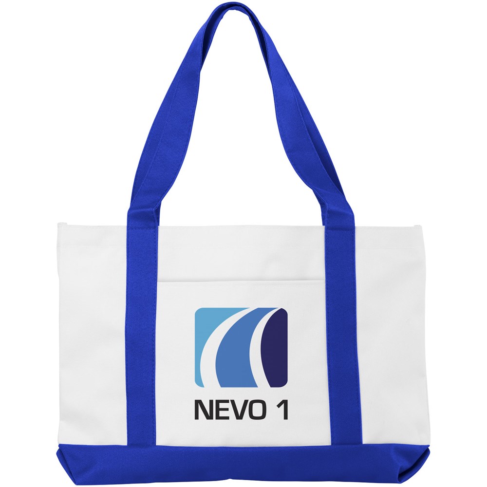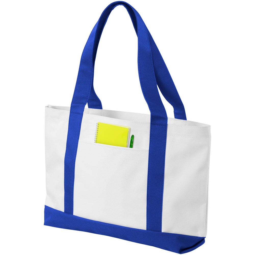 Polyester draagtas met groot open hoofdvak en dubbele hengsels. Draaghoogte 24 cm. Open vak aan de voorkant. Accessoires niet inbegrepen.