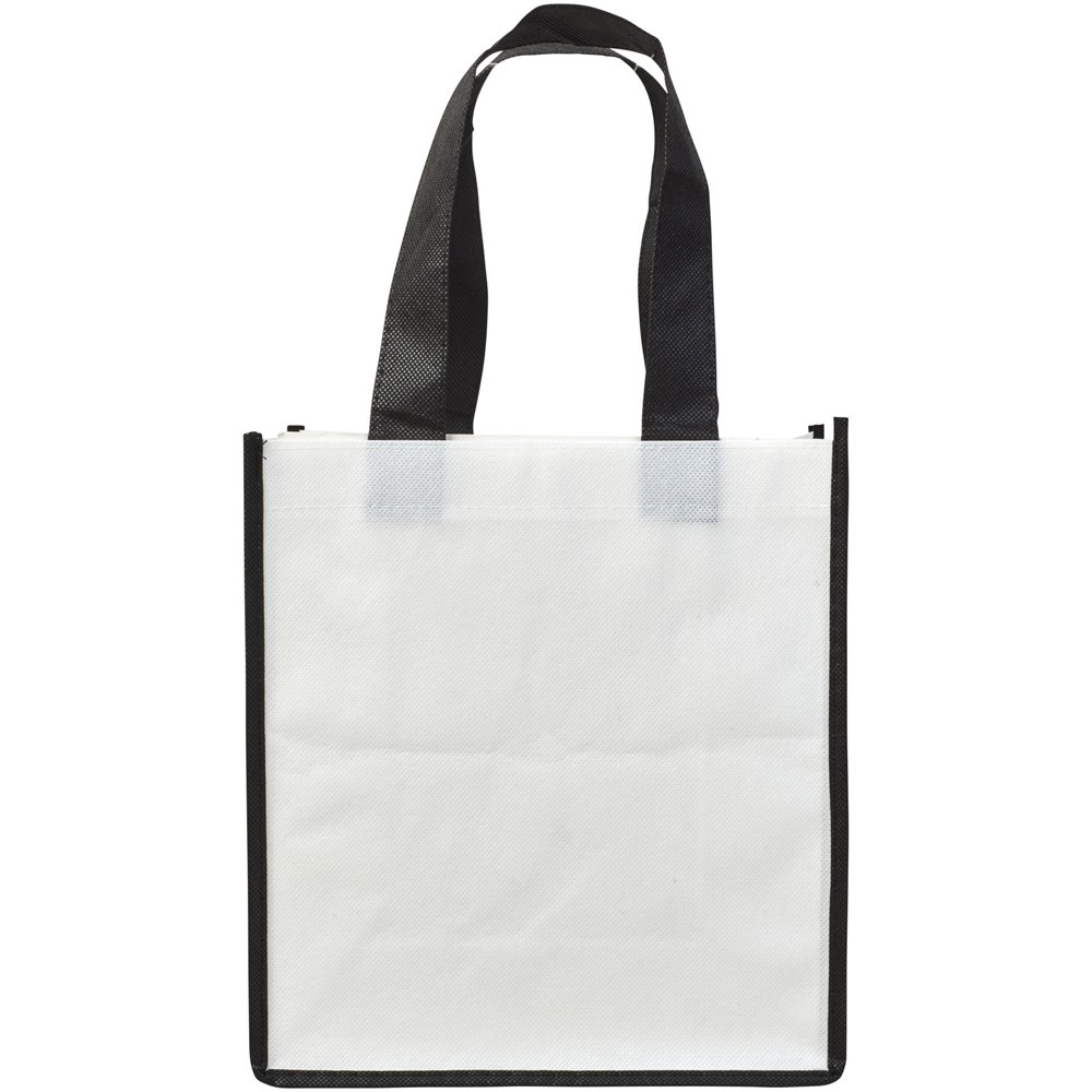 Een boodschappentas gemaakt van wit non woven PP-materiaal met gekleurde hengsels en randen. Fris en kleurrijk ontwerp. Compacte en handige versie van de Contrast Shopper.