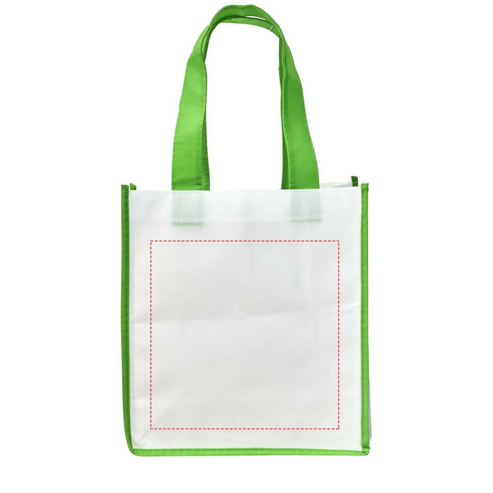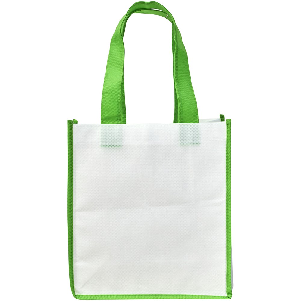 Een boodschappentas gemaakt van wit non woven PP-materiaal met gekleurde hengsels en randen. Fris en kleurrijk ontwerp. Compacte en handige versie van de Contrast Shopper.