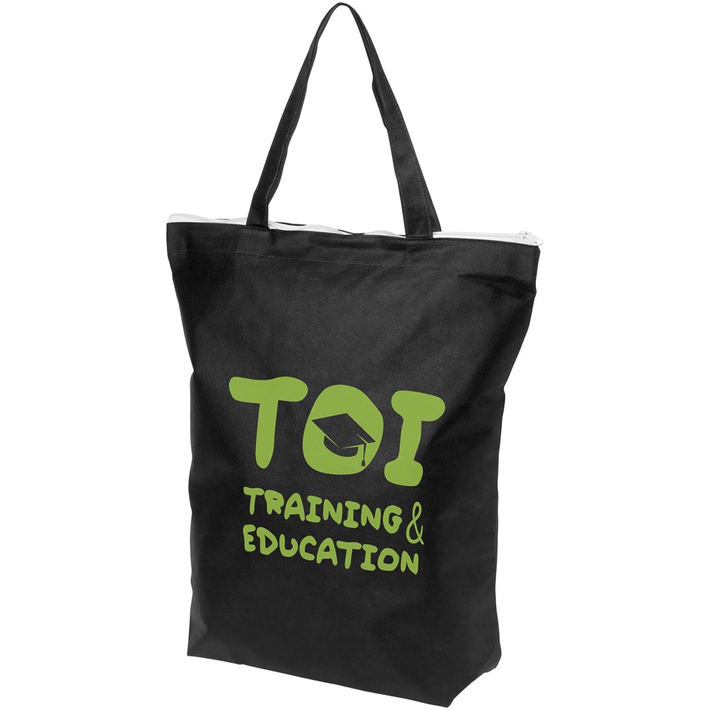 Non woven tas met rits, gestikte afwerking en een hengsel van 19 cm. Een praktisch model in felle kleuren.