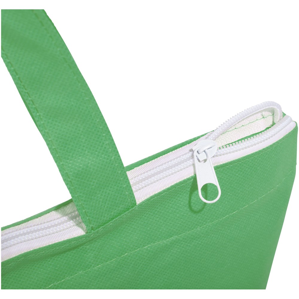 Non woven tas met rits, gestikte afwerking en een hengsel van 19 cm. Een praktisch model in felle kleuren.