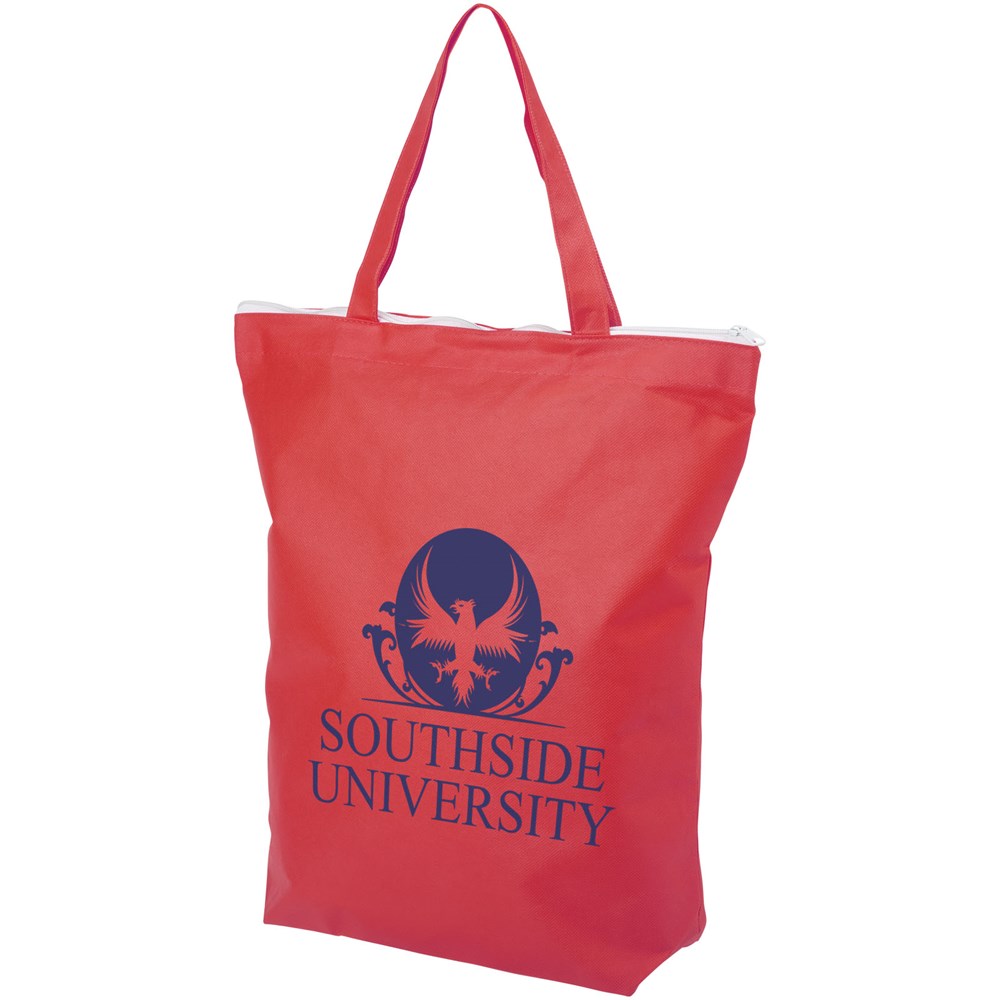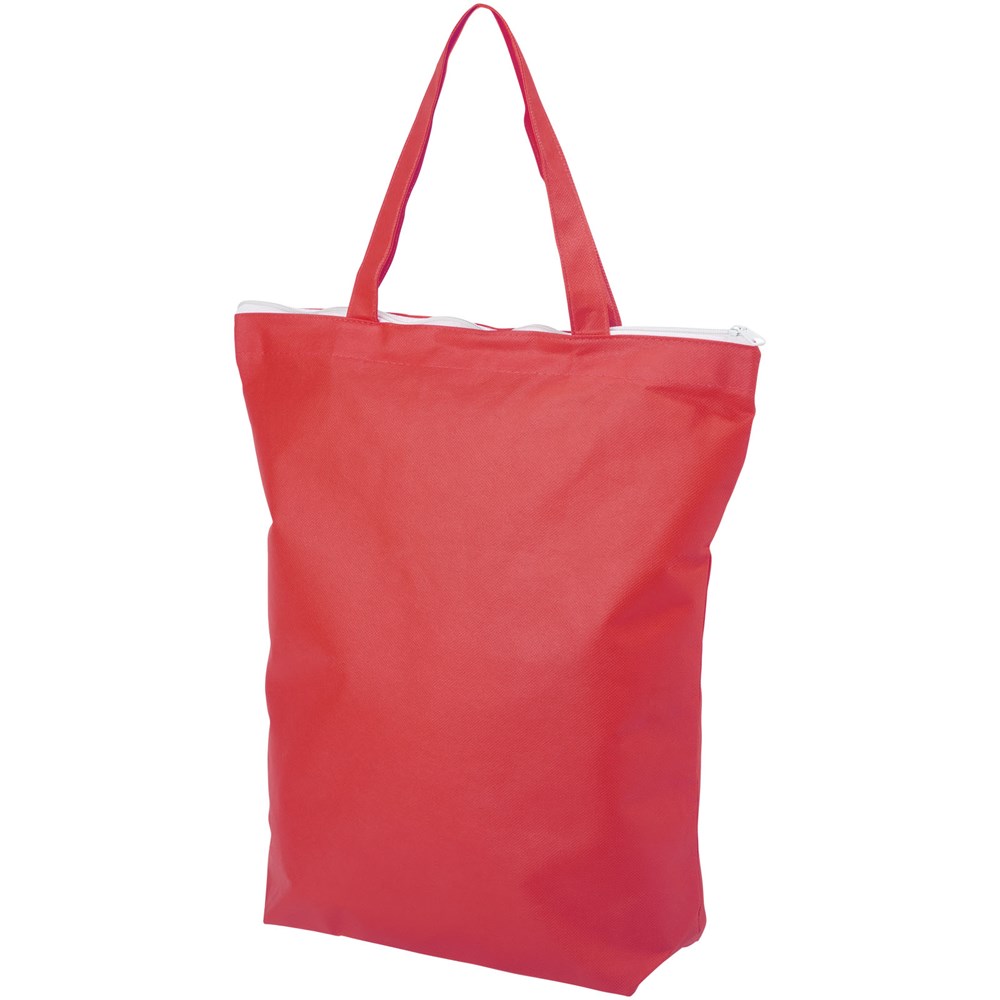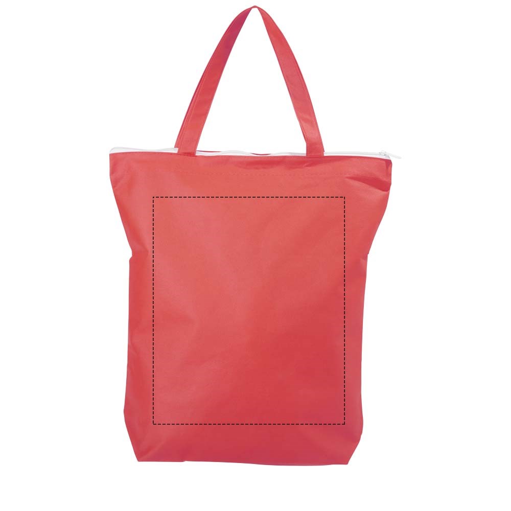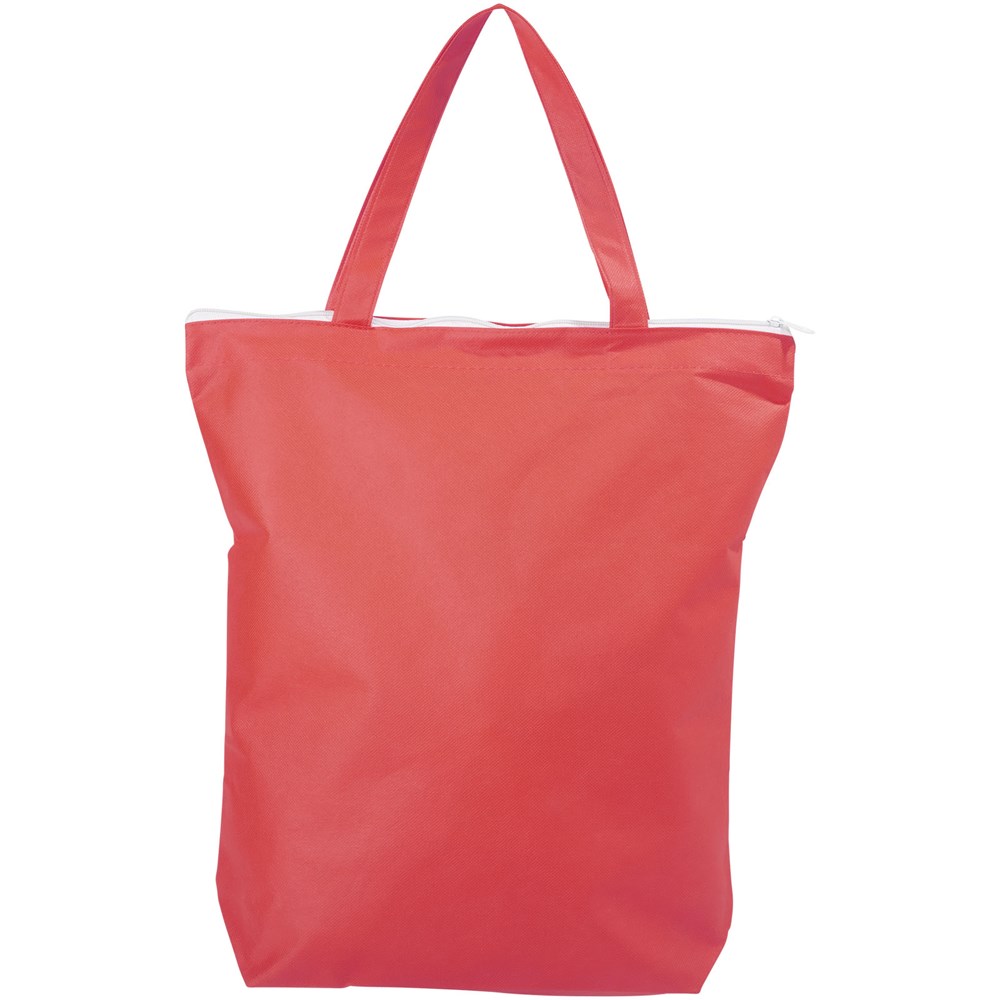 Non woven tas met rits, gestikte afwerking en een hengsel van 19 cm. Een praktisch model in felle kleuren.