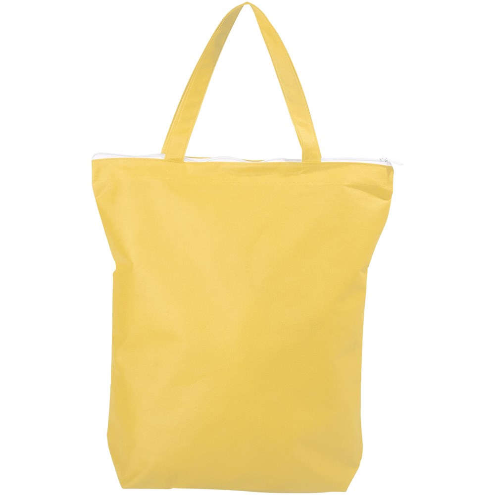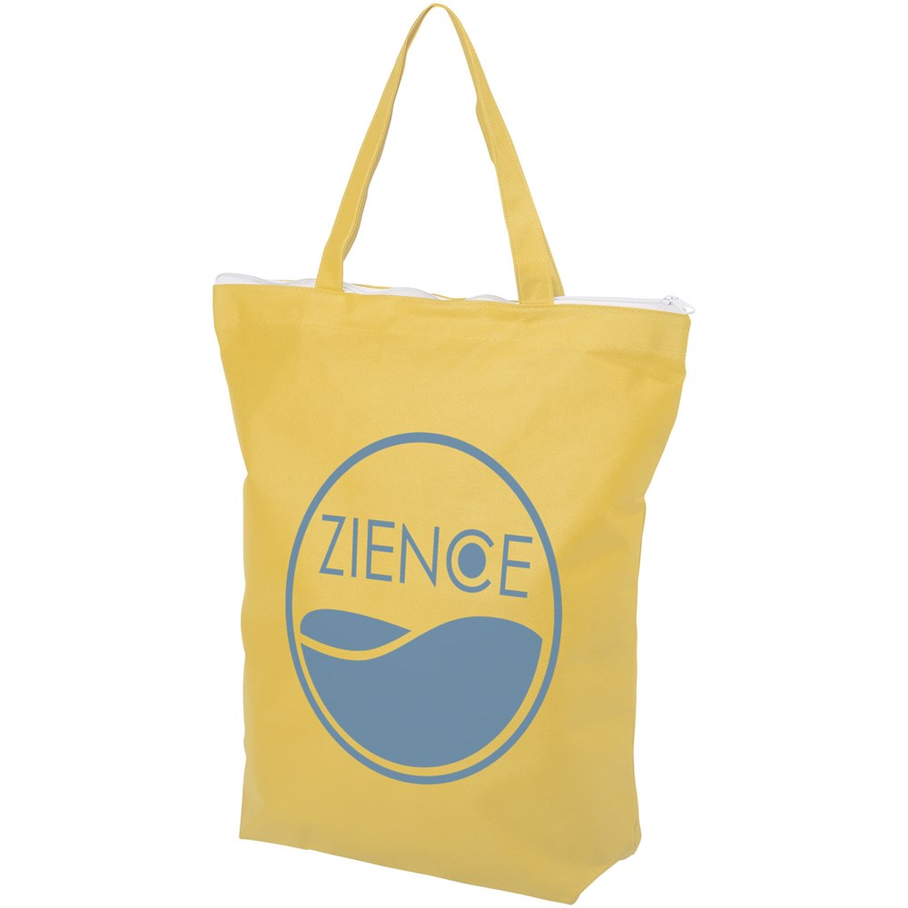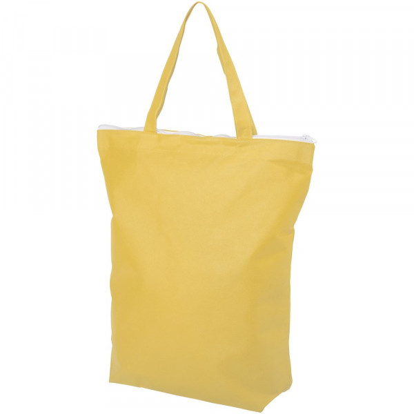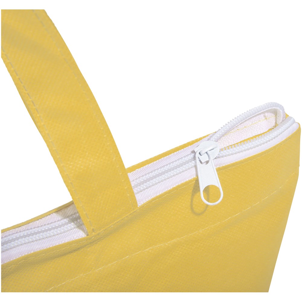 Non woven tas met rits, gestikte afwerking en een hengsel van 19 cm. Een praktisch model in felle kleuren.